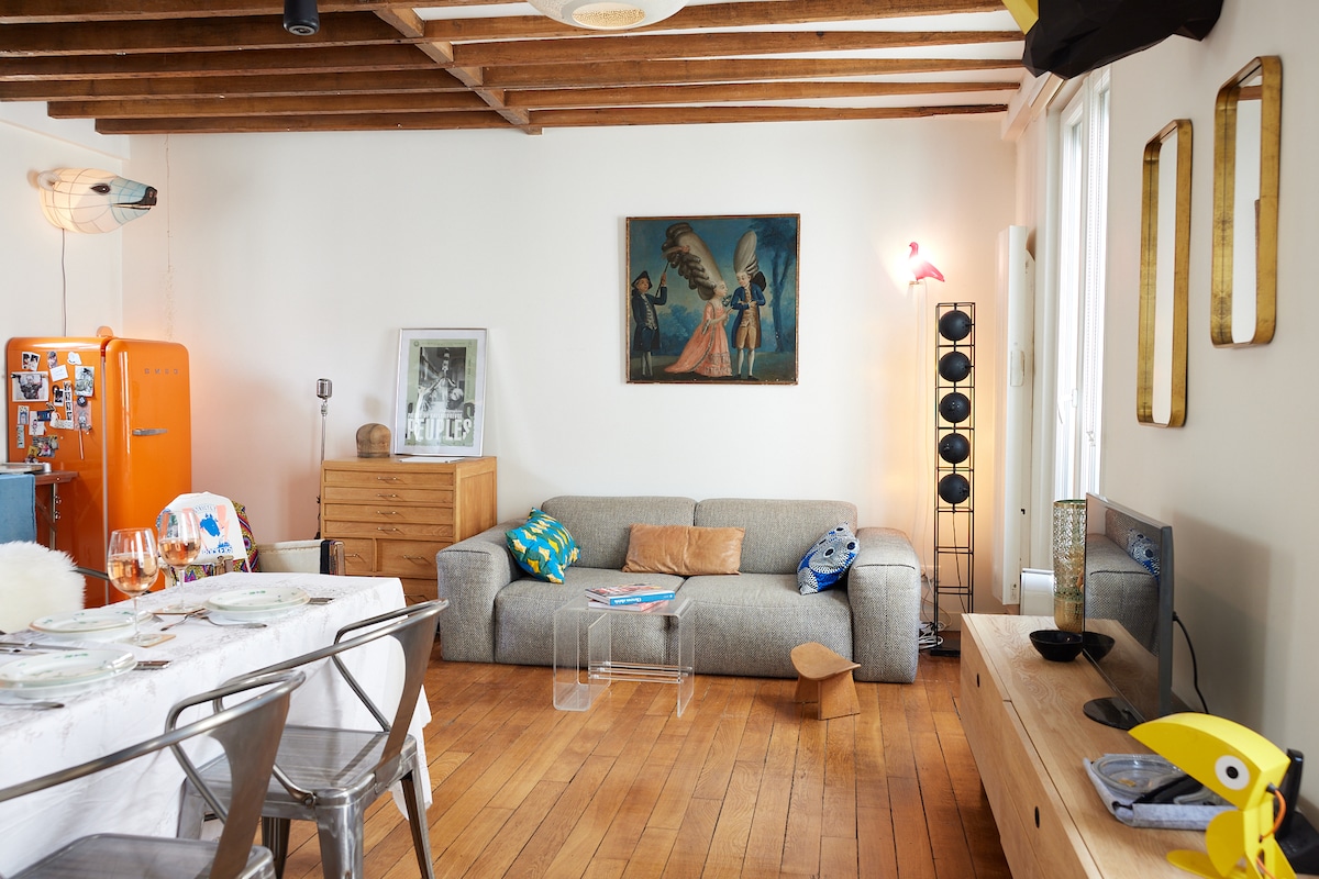 Ця унікальна квартира в паризькому стилі розташована у високому будинку в центрі Маре. Ви маєте всю квартиру самі. Більше нікого не буде під час вашого перебування. Дуже елегантний. Прикрашений відомим дизайнером інтер 'єру. Дерев' яна підлога, старовинні молдинги, вогнище. Супер яскравий і зручний. Тиха і простора з величезною вітальнею площею 40 м2. Шедеври сучасного мистецтва. Приголомшливий вид з балкона Ідеально підходить для пар, які відзначають романтичну подію або ділову поїздку