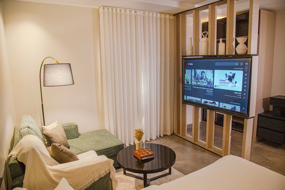 Ласкаво просимо до нашої затишної приватної студії, призначеної для вашого комфорту. 🚪Насолоджуйтеся зручністю самостійного прибуття за допомогою інтелектуальної клавіатури. Насолоджуйтеся Wi-Fi 5G і 75-дюймовим телевізором із Netflix, Shahid і YouTube Premium Для вашої зручності у ванній кімнаті є все необхідне, як-от рушники, мило, шампунь і гель для душу. Усього за хвилину ви знайдете все необхідне, наприклад, мінімаркет, пральню, перукарню та ресторан.