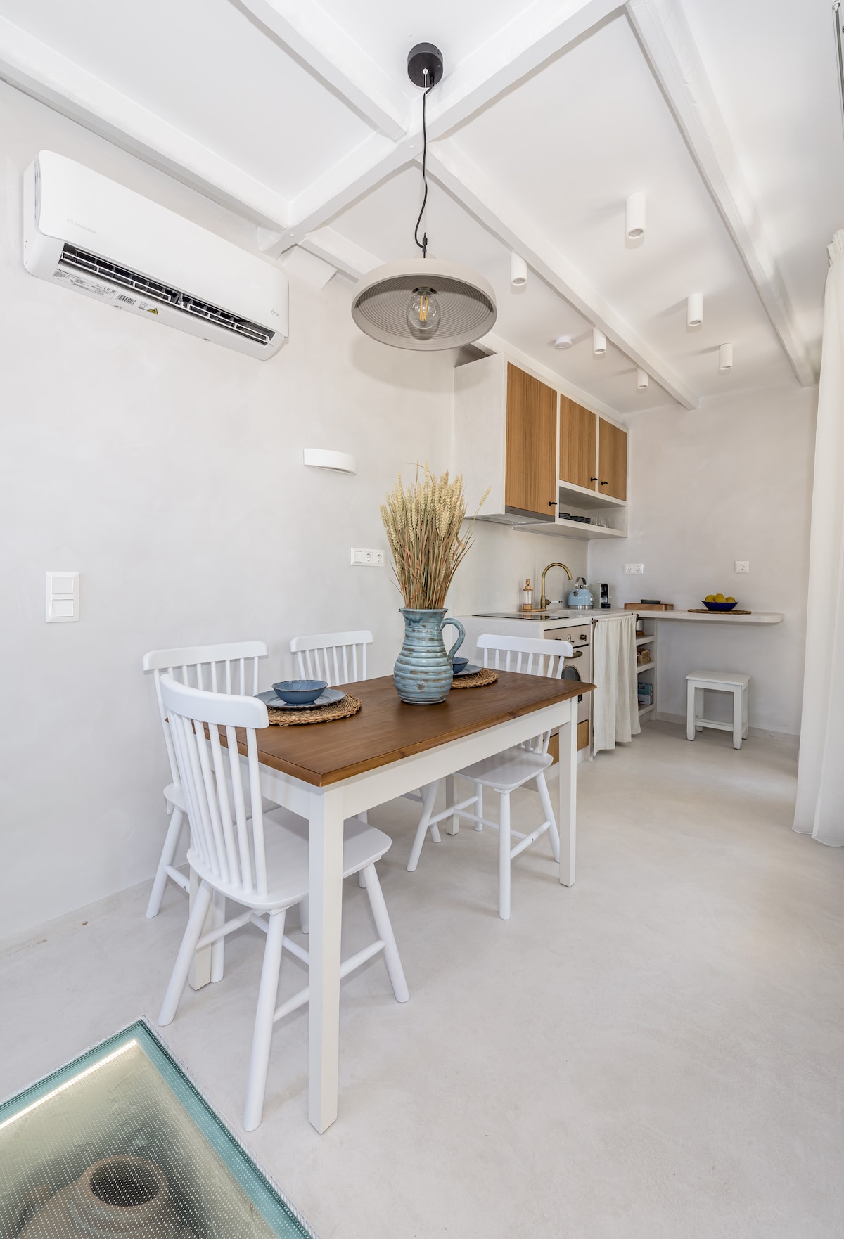 Приватна квартира на фермі з високою стелею зі спальнею та ванною кімнатою. Спеціальний кухонний куточок, приготування сніданку та холодних страв. 2 балкони (загалом 40 кв. м), з панорамним видом на порт перед ним і море Саракініко (місячний ландшафт знаходиться всього в 15 хвилинах ходьби). Відстані: 4 хвилини від порту та 7 від аеропорту на автомобілі. Плака: 5 км, Поллонія: 7 км, Fyriplaka-Tsigrado за 15 хвилин. Нещодавно облаштований сад, природне середовище з приватністю та спокоєм