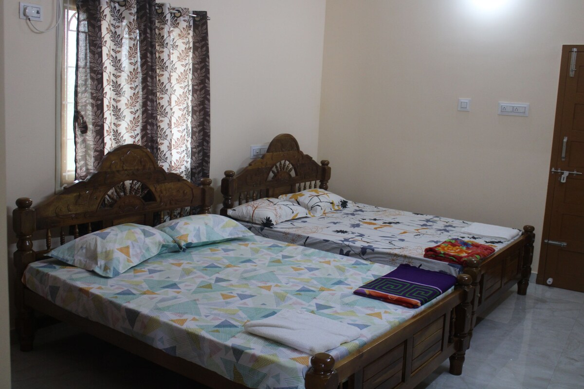 Ми пропонуємо затишне та доступне помешкання для мандрівників. Кімната знаходиться всього в 5 хвилинах ходьби від залізничного вокзалу Тіручендура або автобусної зупинки, яка швидко доставить вас до всіх основних місць у місті та його околицях. У нас є схожі помешкання поблизу для гостей, яким потрібен додатковий будинок за доступними цінами. Наша нерухомість підходить для проведення невеликих функцій, таких як пірсинг на вухах, церемонія Мундана тощо.
