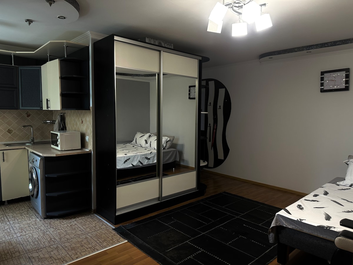 Спокойное жилье для расслабленного семейного отдыха, 4-ый этаж, довольно тихо, соседи не шумные и беспокоить не будут), отличное место как для пар так и для семей с детьми, 1 спальня, в ней просторный шкаф, не большой телевизор, двухместная кровать, тумбочка,ванная комната состоит из душевой, туалета и раковины над ней зеркало, зал довольно просторный, диван,стол, шкаф,телевизор, зал совместный с кухней, на кухне у нас есть раковина, плита, стол,стулья