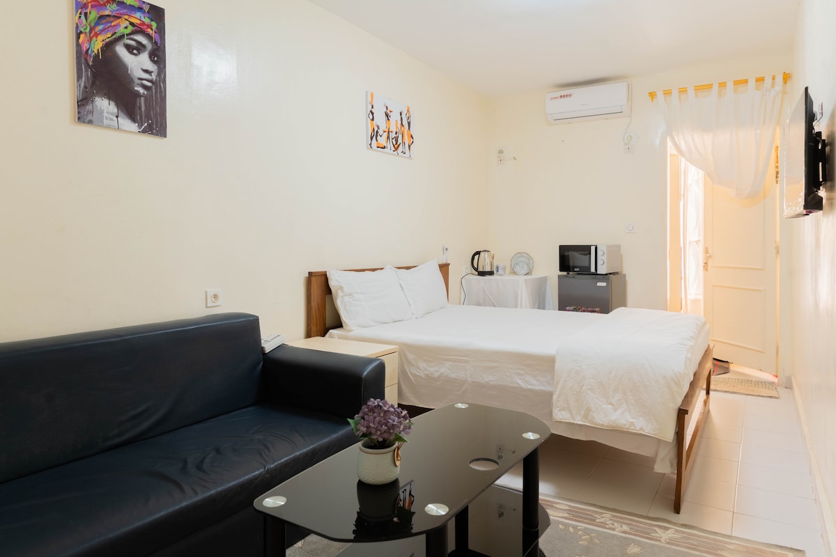 Приходьте і відкрийте для себе Дакар у затишній квартирі для 1-2 осіб, розташованій поруч з пам 'ятником «Дакар Ренесанс». Помешкання розташоване в безпечному помешканні в тихому районі. Вона включає спальню з кондиціонером, зону відпочинку, кухню та ванну кімнату. Поруч є кілька торгових майданчиків, таких як ресторани, преси та аптеки. Прибуття доступне 24 години на добу