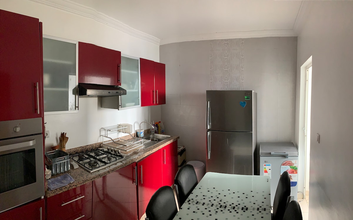 Ласкаво просимо до нашої світлої та простої квартири, ідеально розташованої на першому поверсі будинку в жвавому районі в центрі Агадіра. Кілька кроків від найкращих визначних пам’яток, ресторанів, кафе. І магазини - громадський транспорт; - Супермаркет та аптека поблизу, пляж 12 хв. Ідеально підходить для пар, сімей або бізнес-мандрівників; невеликий жест, щоб ви почувалися як удома! Ми пропонуємо кошик зі свіжими фруктами та пляшки води безкоштовно