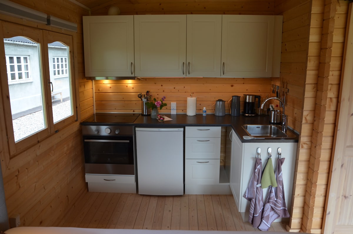 Чудова прибудова, прекрасно розташована на території заміського помешкання. Вид на сад і поле. Власна ванна кімната. Постільна білизна/рушники включені. Телебачення з функцією Chromecast. Доступні необхідні послуги, а також мікрохвильова піч і холодильник. На території об 'єкта нерухомості площею 6 га, іноді ходять коні, сусіднє помешкання є одним із найбільших виноградників Данії. У цьому районі є можливості для чудових прогулянок. Це близько 12 км до Колдінга та Фредерісії . Магазини приблизно за 6 км; приблизно 35 км до парку «Леголенд». До нашого помешкання не курсує громадський транспорт.