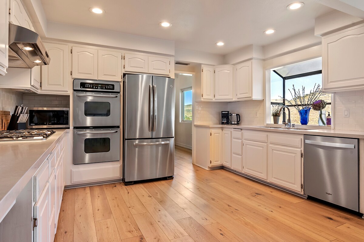Покращіть свій спокій, насолоджуючись захоплюючим видом на поле для гольфу та гори, що оточують цей сучасний, зручний, великий будинок із 5 спальнями та 3 ванними кімнатами. Лише в декількох хвилинах ходьби від автостради, але в той же час спокійне оточення в районі Сансет-Гіллз у Таузенд-Оукс. Відпочиньте в нашій новій гідромасажній ванні!! Відпочиньте, спостерігаючи за краєвидами сходу сонця на заході сонця. Чудова відкрита кухня, величезна їдальня, три соціальні/вітальня/вітальня. У кожній спальні є ліжко queen-size для комфортного нічного відпочинку. Безтурботність чекає на вас.