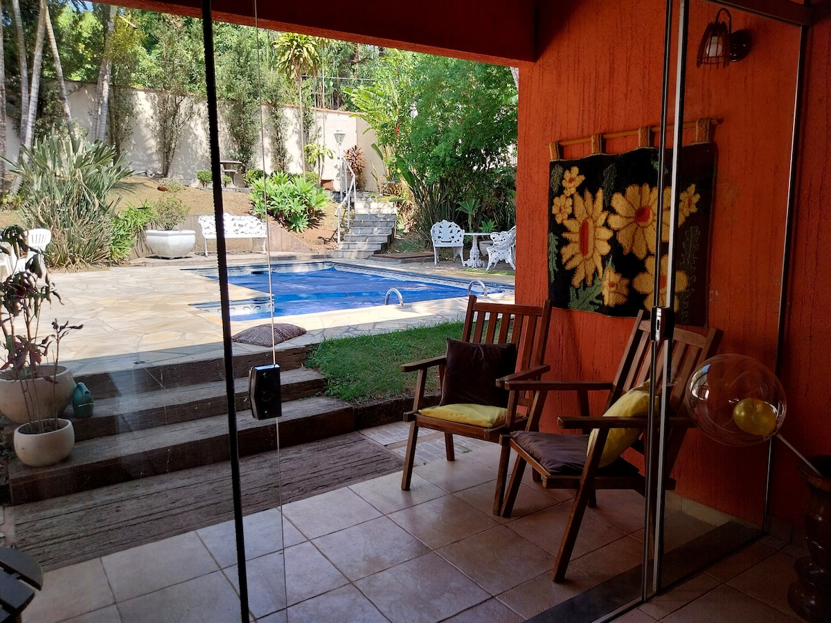 Зробіть перерву, щоб відпочити та насолодитися найкращим, що є в Агуас-да-Прата, в цьому унікальному помешканні з приватним критим басейном, сауною, барбекю в затишній обстановці. Надворі – простір для сніданку на відкритому повітрі, оточений тихим садом. 🌙 Уночі атмосфера стає ще особливішою завдяки м’якому освітленню та краєвиду на місяць! ПРИМІТКА: у головній ванній кімнаті є лише джакузі, в іншій – лише туалет! Душ тільки в зоні басейну! Будинок обігрівається сонячною енергією!