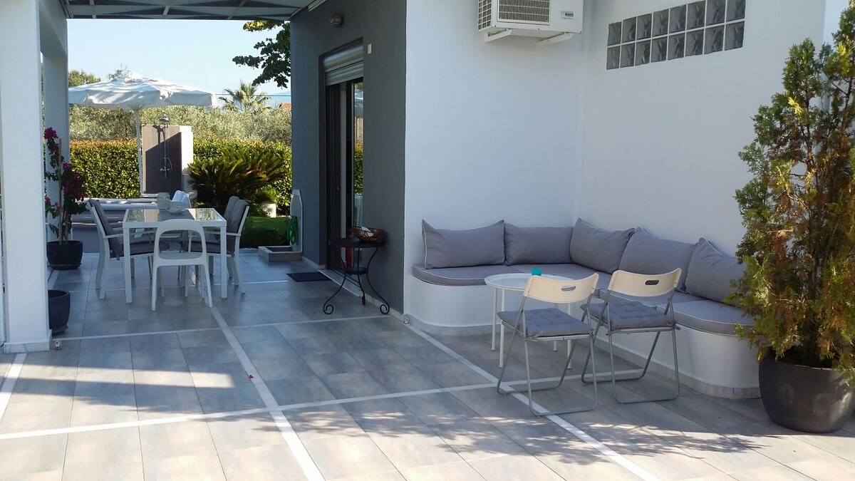 Наші друзі кажуть нам, що це ідеальний курорт, коли вони відвідують його. Дійсно, будинок є двоповерховим дуплексом на ділянці площею 1200 м2 з великою кількістю зелені та басейном. Він розташований у гарному місці в 300 метрах від чудового пляжного будинку приблизно в 800 метрах від центру космополітичного Платамонаса. Поруч багато атракціонів, таких як археологічні пам 'ятки,традиційні села біля моря та гірський Олімп, гора Богів.