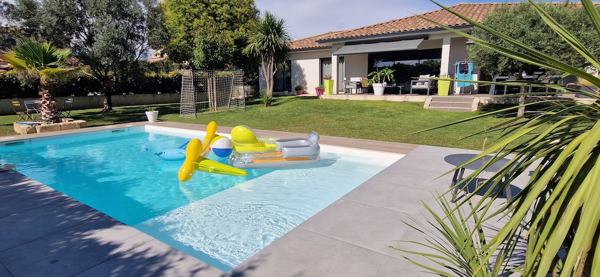 15 хвилин від моря, у чарівному тихому селищі між Німом і Монпельє. Котедж площею 70 м2 на першому поверсі (2 спальні, туалет, вітальня, обладнана міні-кухня та зручна ванна кімната. Сучасний і затишний декор. Дуже приємне помешкання, щоб дослідити наш район. На місці ми можемо вас допомогти! Легка, безпечна та безкоштовна вулична парковка. Басейн і патіо доступні для дорослих лише в тиші (ми живемо і працюємо навколо цього помешкання)