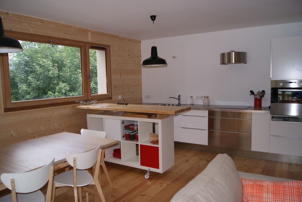 Відпочиньте в цьому тихому і сучасному помешканні в маленькому гірському селищі. Ідеально розташований з близькістю 300 м до центру села, такими магазинами, як м 'ясна лавка, пекарня, супермаркет, ресторани, лижна школа, гірськолижна зона, прокат обладнання, катання на снігоступах. Ви можете припаркуватися біля підніжжя будівлі з приватною парковкою. Тераса з прекрасним видом на гори та селище.