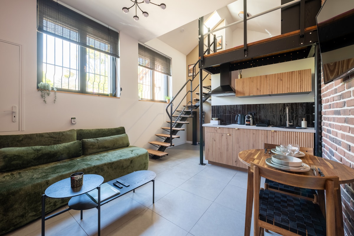 Відкрийте для себе наш прекрасний лофт в індустріальному стилі, який поєднує в собі автентичність і сучасність. Відкрита цегляна стіна, сталевий мезонін, створює міську та теплу атмосферу. Деревина призводить до вінтажної сторони. Приміщення відкрите, світле та функціональне, з обладнаною кухнею, затишною маленькою вітальнею та обіднім столом. Декоративні штрихи, такі як ретро люстра, додають характеру та шарму. Красива ванна кімната доповнює це нетипове помешкання для зручного перебування.