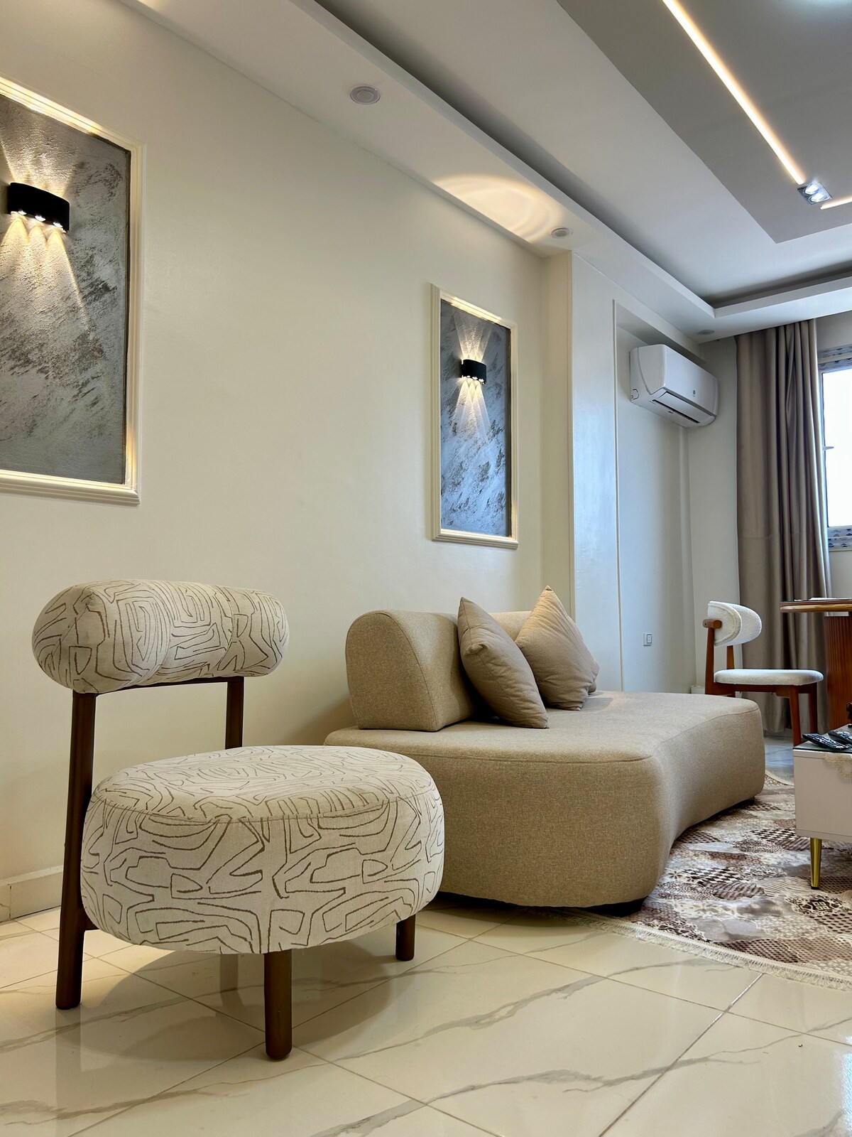 Всього в 5 хвилинах ходьби від входу до величних воріт пірамід, ця квартира розташована в нещодавно побудованій будівлі, розташованій в автентичному місцевому районі, який дихає життям і автентичністю Каїра, водночас забезпечуючи безпечні враження... У цьому автентичному куточку сусідні вулиці зберігають свій традиційний шарм, навіть якщо вони ще не були асфальтовані. На вулиці можна знайти коней і верблюдів