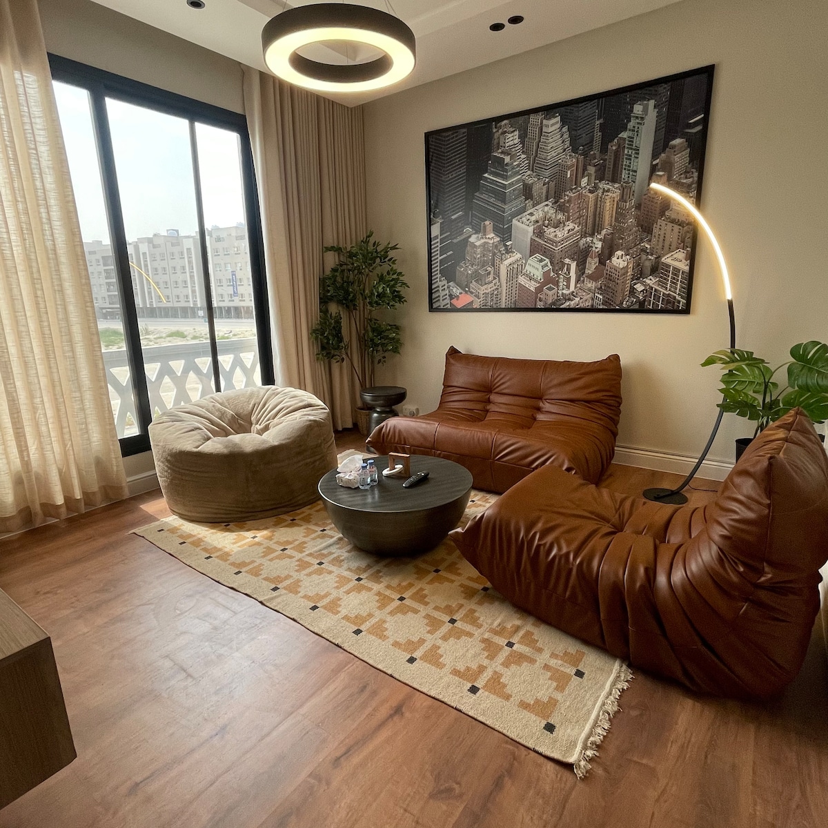 يتميز مكان الإقامة بتصميمه العصري الدافئ الذي يجمع بين البساطة والفخامة في آن واحد تطل النوافذ الكبيرة على منظر هادئ يضيف لمسة طبيعية منعشة، بينما توفر الستائر السميكة خصوصية تامة عند الحاجة. الغرف مزودة بجميع وسائل الراحة الأساسية، ومنطقة الجلوس أنيقة مثالية للقراءة أو الاسترخاء أما الحمام، فهو مصمم بأسلوب راقٍ، مزود بتجهيزات ولمسات فندقية تضمن تجربة مريحة. تتميز المساحة بنظافتها الفائقة وتنظيمها العملي، مما يجعل الإقامة تجربة هادئة تمنح الضيوف شعورًا بالاستجمام والرفاهي
