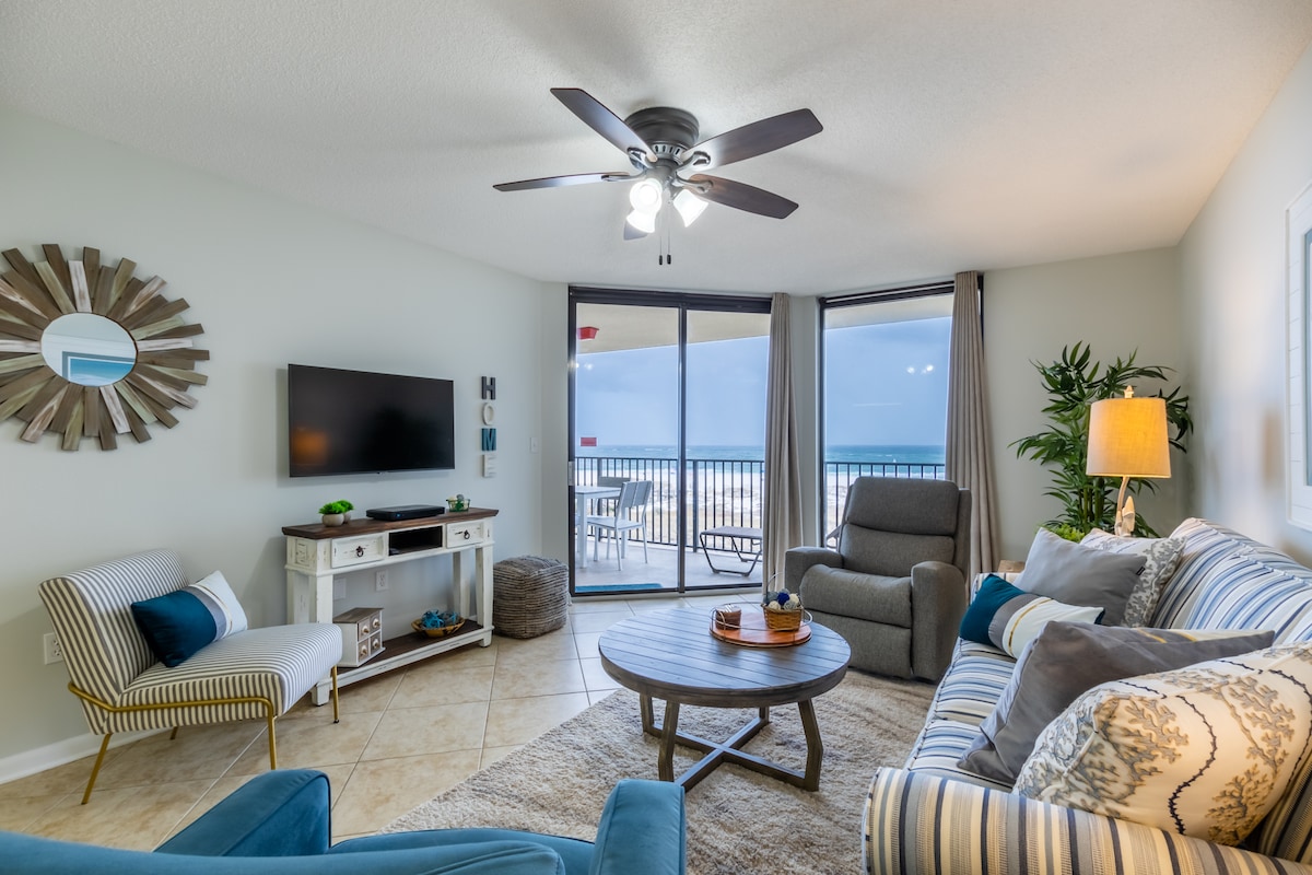 Вам сподобається цей просторий кондомініум 3BR/2BA Beach Front! Легко дістатися до білих піщаних пляжів із цукром - просто на відстані короткої доріжки! Вам сподобається прекрасний вид на океан і басейн як із вітальні, так і з головної спальні! Обидві кімнати мають розсувні скляні двері на балкон передньої частини затоки, обладнаний столом і стільцями. Ви насолоджуватиметеся ранковою кавою або келихом вина на заході сонця на балконі, насолоджуючись прекрасним видом на Мексиканську затоку.