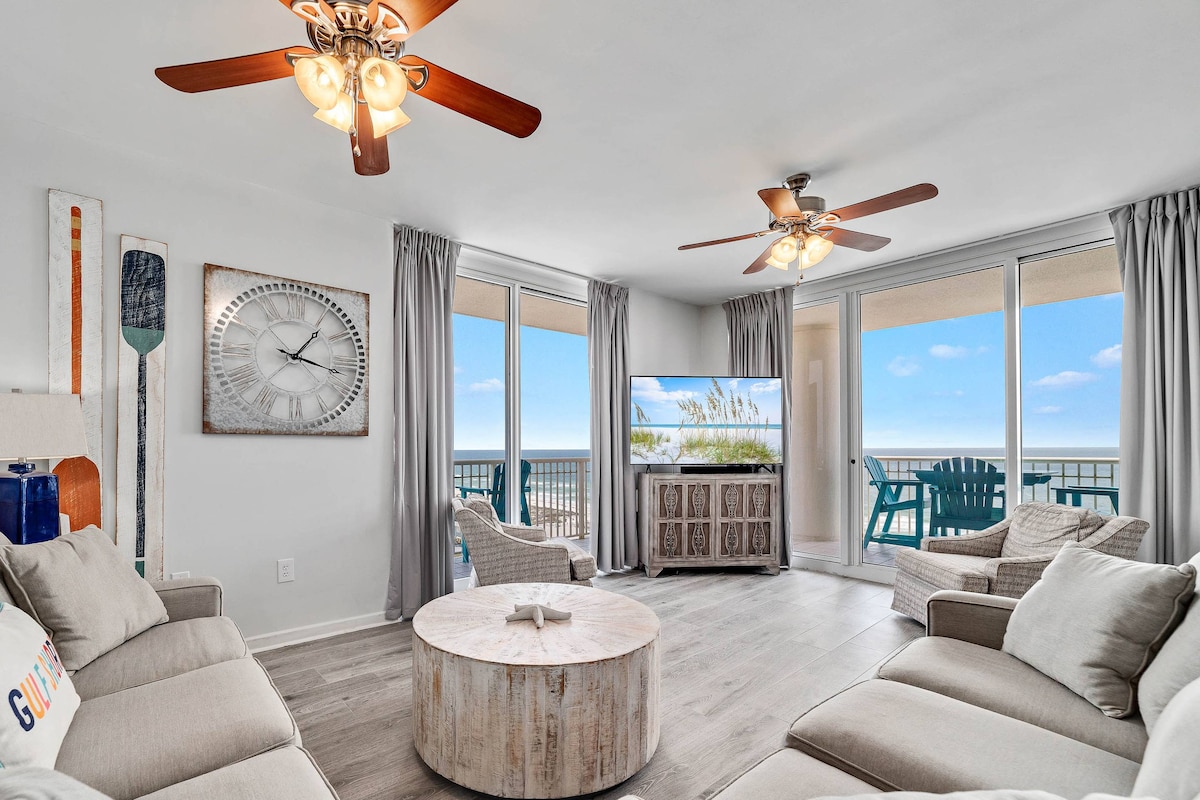 Відчуйте розкіш узбережжя в цьому кутовому кондомініумі з 3 спальнями/3 ванними кімнатами на березі моря в Оранж-Біч, штат Алабама. Насолоджуйтеся панорамним видом на затоку на 180°, достатньою кількістю природного світла та відкритою плануванням, ідеальним для відпочинку або розваг. Серед зручностей – повністю обладнана кухня, Smart TV, швидкісний Wi-Fi, власний балкон з обіднім куточком на відкритому повітрі та повністю укомплектована шафа для пляжного одягу. За кілька кроків від білосніжного піску – ідеальне місце для незабутнього пляжного відпочинку.