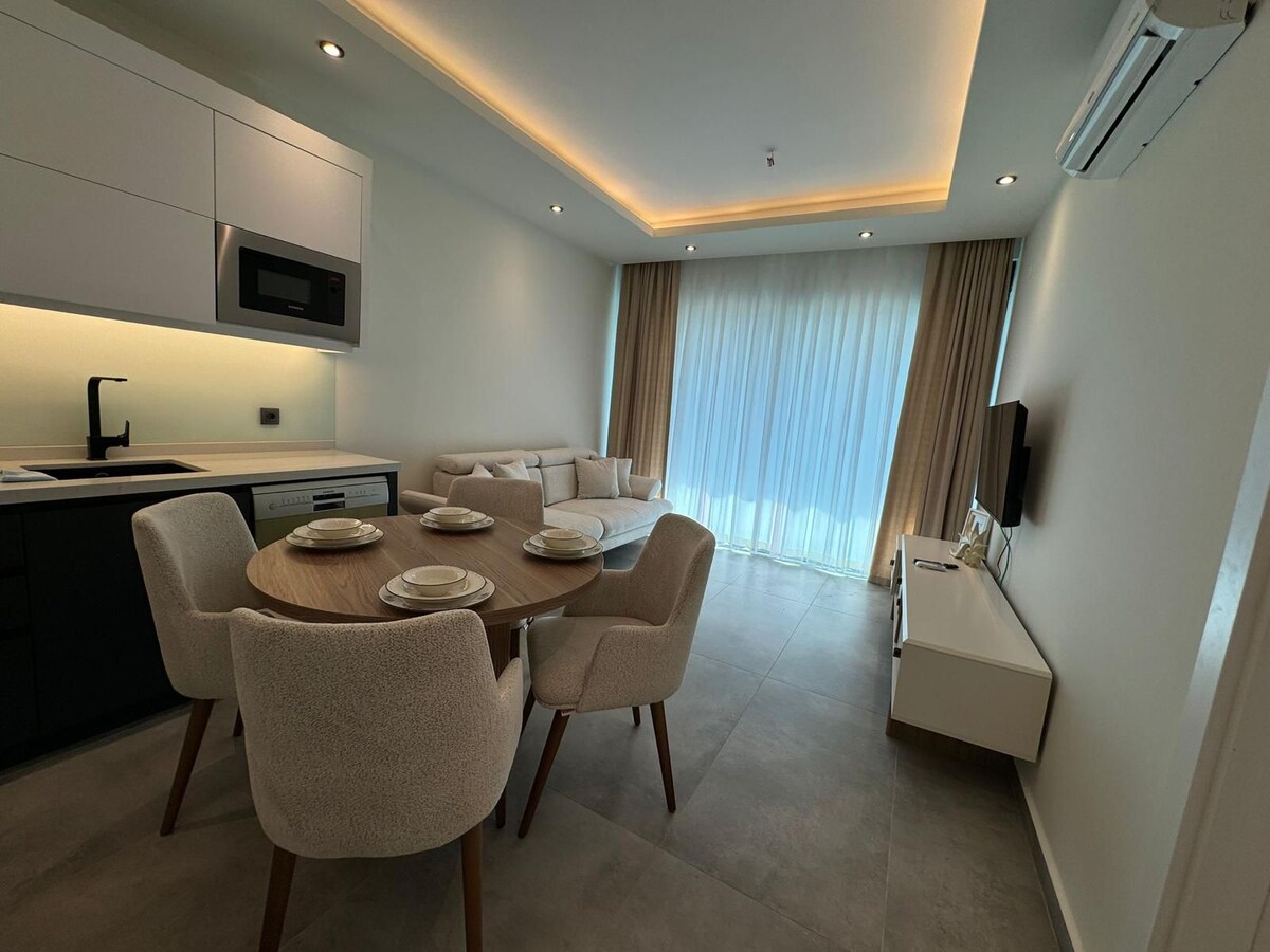 Чудова квартира з 1 спальнею на березі моря Квартира Lexus Residence (70 кв. м) з виходом на пляж і море. Повний комплекс заходів у будь-яку пору року з великим балконом, щоб насолоджуватися ранковою кавою та їжею. Самостійне прибуття за допомогою смарт-клавіші 7 км до центру та 35 км до аеропорту Газіпаша. 130 км до аеропорту Анталії Залежно від сезону Великий відкритий і критий басейн, фітнес, водна гірка, тенісний корт, ігрова кімната, кіносалон, дитяча ігрова кімната. Кімната для вечірок (турецька лазня та сауна відкриті у вихідні дні), зона для барбекю та цілодобова охорона