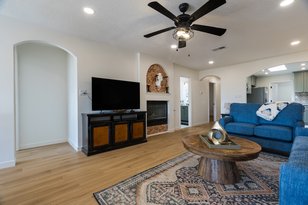 Ласкаво просимо в Moon Haven! Відпочиньте і розслабтеся в цьому спокійному, стильному будинку. Дві спальні, дві ванні кімнати та окреме патіо - усе в центральному, безпечному районі з деревами. Насолоджуйтеся красиво мебльованою вітальнею, медіа-куком, їдальнею, офісною зоною та плюшевими спальнями. Насолоджуйтеся повністю обладнаною кухнею та барбекю. У кожній спальні є ліжко Queen Size. В одній зі спалень також є розкладний диван, який перетворюється на односпальне ліжко. Відкрийте для себе новий улюблений притулок Альбукерке!