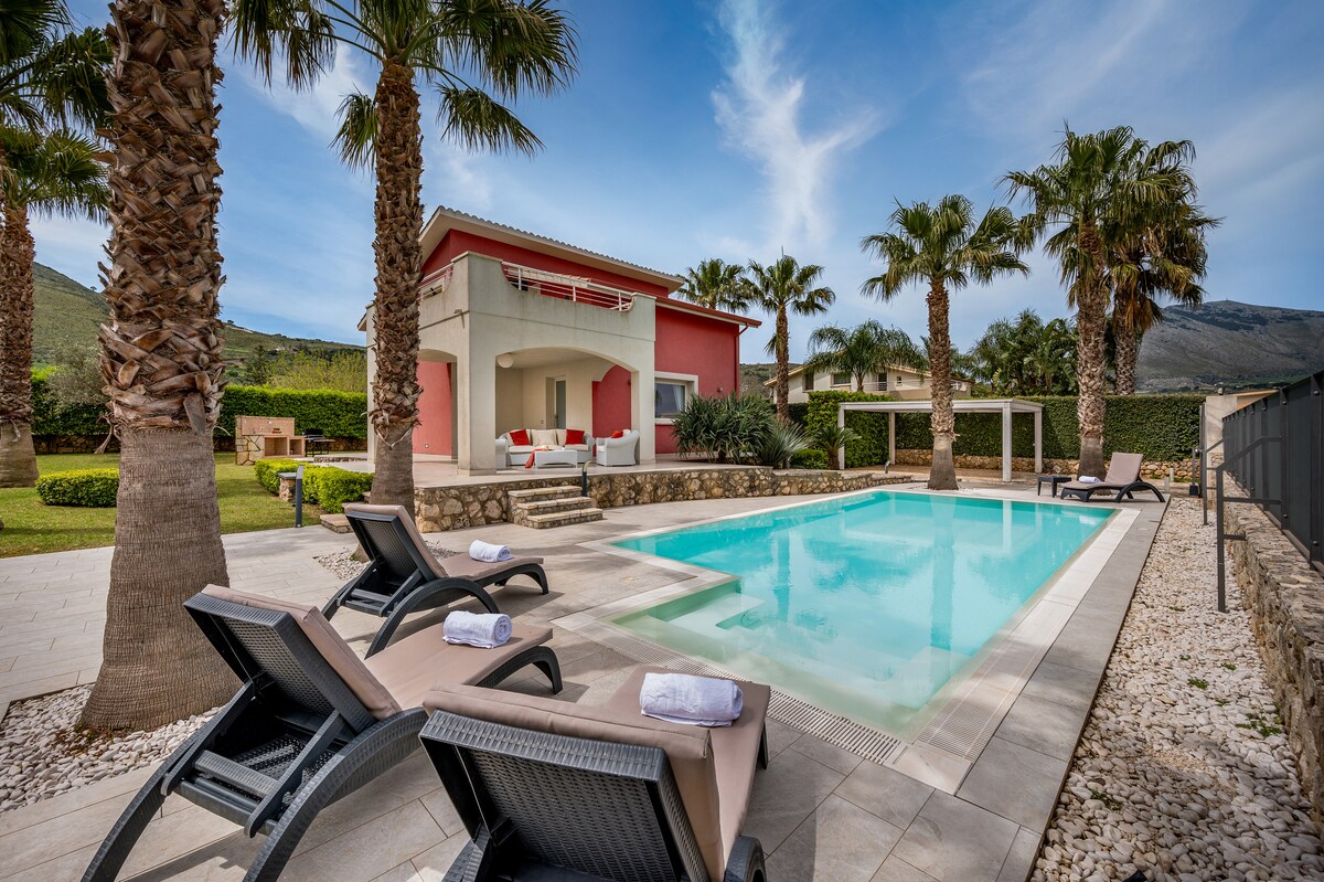 Вілла Малу розташована на невеликому пагорбі з видом на море, що надає гостям надзвичайні враження. Вілла має прекрасний безмежний басейн з видом на затоку Кастелламмар-дель-Гольфо, оточений добре утримуваним газоном, багатим рослинністю, який занурює гостей у вишукану атмосферу та абсолютний відпочинок. Пісочний пляж знаходиться всього в 200 м пішки, а Скопелло та Сан-Віто-ло-Капо - всього в кількох кілометрах.