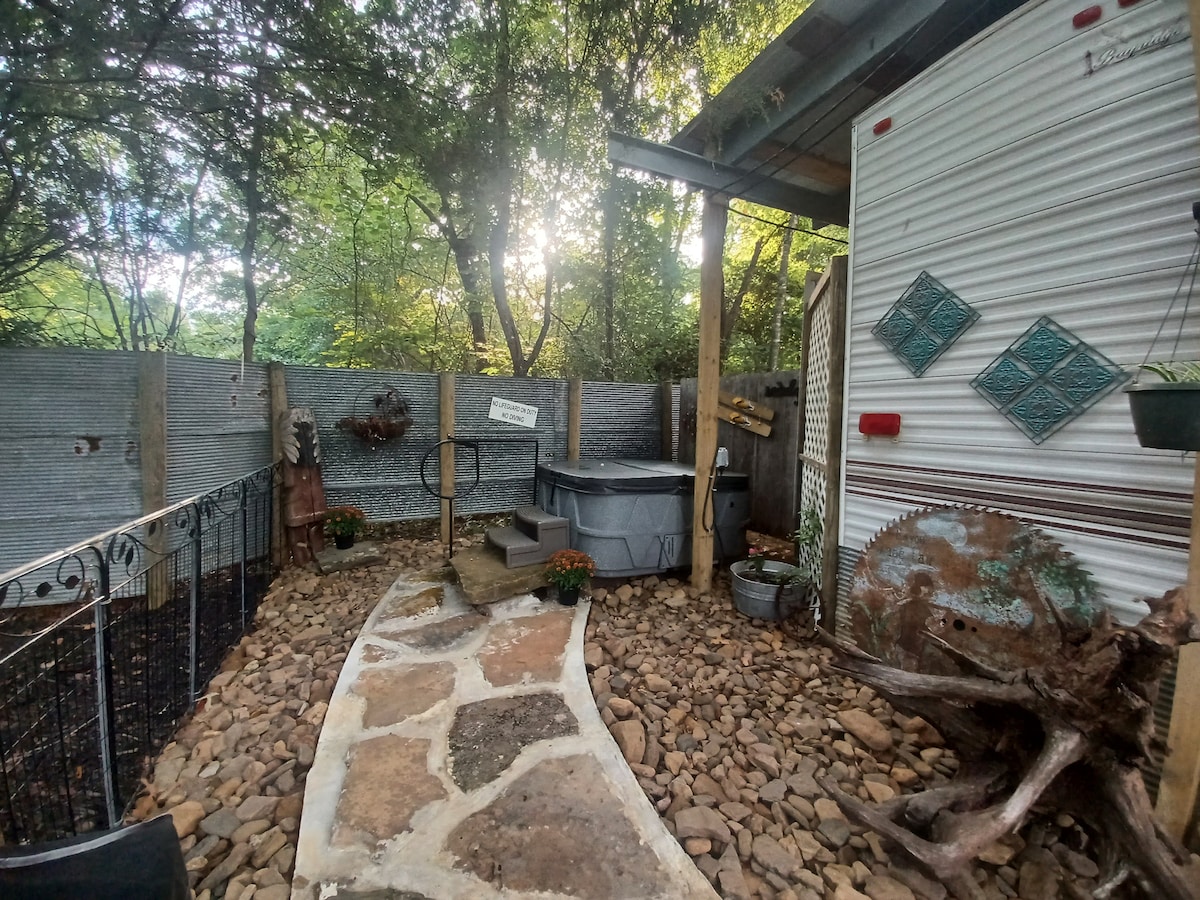 Get away from the busy! Sit back and enjoy the serene atmosphere of our cozy little trailer in the foothills of the Arkansas Ozarks. A short little dirt road ride will get you to our Country Escape. Come relax and let your worries drift away. Roast marshmallows at the outdoor firepit with firewood we provide. Cook a meal on the grill, gas or charcoal. Hang out in the hammock as nature lulls you to sleep. Slip into the relaxing hot tub, a great way to start or end the day!
