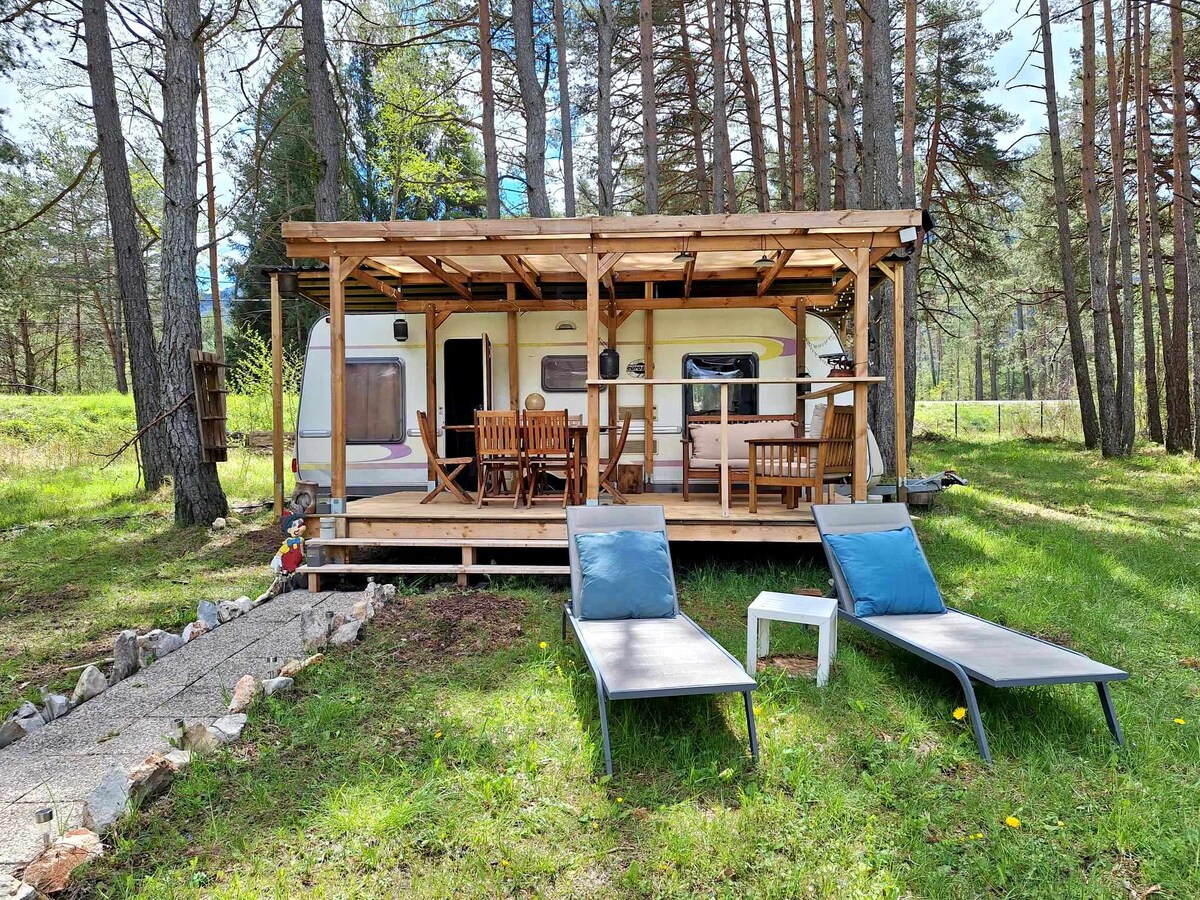 Розташований на висоті 800 м над рівнем моря на великій ландшафтній квартирі площею 2000 кв. м, ви будете спати в дуже красивому і великому фургоні для хобі з 2 односпальними ліжками, ванною кімнатою та кухнею на відкритому повітрі. Можливість встановити додатковий намет на території. Наша територія знаходиться безпосередньо за ущелиною Далюс (Колорадо-Нісуа) і біля входу в туристичне селище Гійомес, Порт-д 'вход до парку Меркантур. Легкий доступ і безкоштовна парковка на території, закрита для мотоциклів.