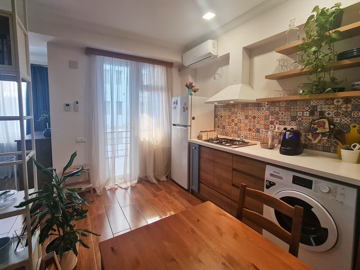 Ця красива сучасна квартира-студія знаходиться всього в 2 хвилинах ходьби від найчистішого пляжу міста, в 5 хвилинах ходьби від центральної площі міста та всіх туристичних зон, кафе та ресторанів. Ліжко розміру King size зі скляним вікном для нічного неба та спостереження за містом. Кухня повністю обладнана всім необхідним. Він чудово тихий і захищений системами високої безпеки. До станції прокату велосипедів всього 20 секунд, яка ідеально підходить для велопрогулянки вздовж Батумського бульвару.