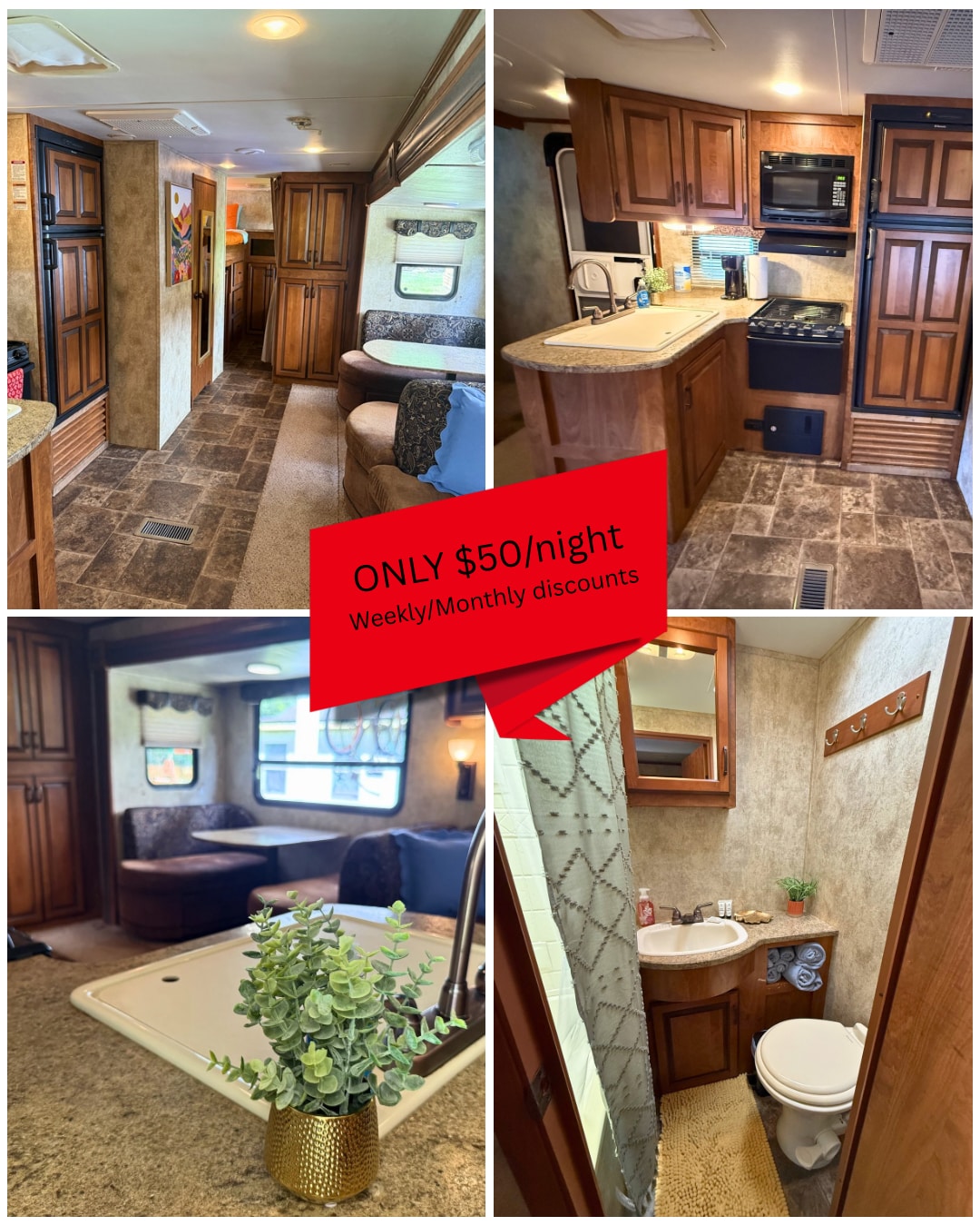 This is a clean 2006 33' 5th wheel RV. 3 Slideouts, refrigerator, Stove/oven, microwave, Keurig coffee maker. Kitchen ware and utensils. Bed room has a privacy door with King bed. Couch has a pull out bed. Bed room and living room ACs. Central heat. Kings Ferry RV Resort is on the Ogeechee River, Dock access/use is included, With boat ramp on property. We are about 20 mins from downtown Savannah and mins to Shopping, Groceries and Restaurants. Site offers a spacious deck on the river.
