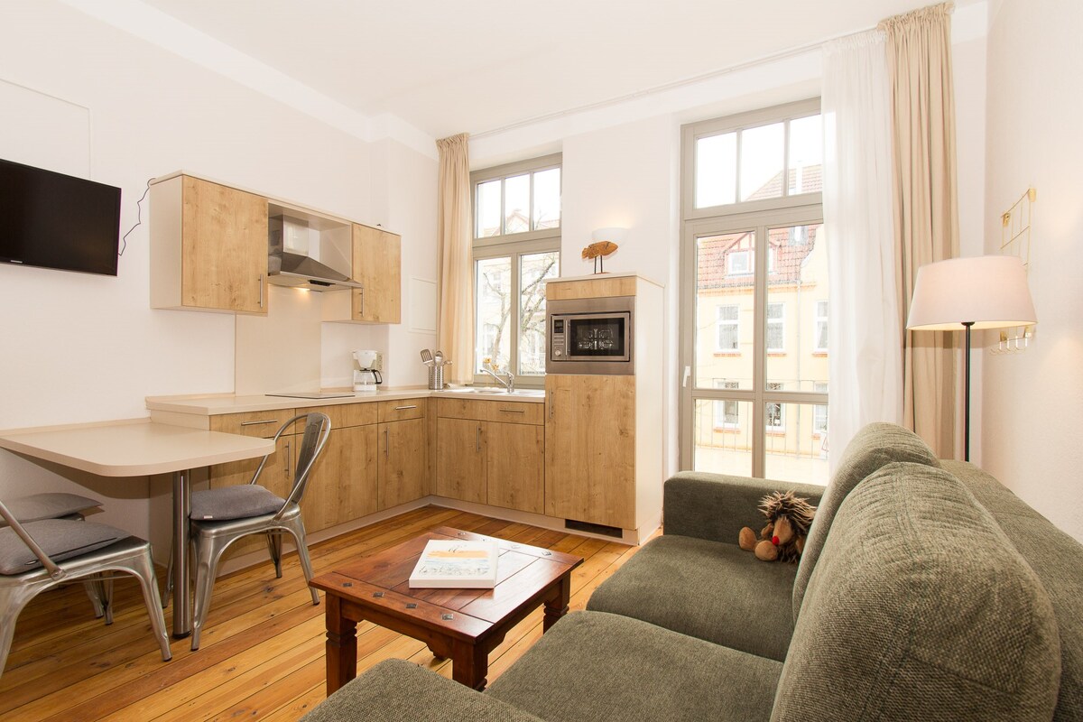 Die Villa Ostseenordstern liegt im Herzen des Ostseebades Warnemünde, in einer ruhigen und doch zentralen Lage. Sie wurde 2019/2020 umfassend saniert. Es erwarten Sie stilvoll eingerichtete Appartements bzw. Studios für jeweils 2 bis 4 Personen. Das helle ca. 36 m² große Appartement im 1. Obergeschoss verfügt über einen großzügigen Wohnbereich mit voll ausgestatteter Küche, einem zum Garten ausgerichteten Schlafzimmer sowie einem modernen Badezimmer mit großzügiger Dusche.