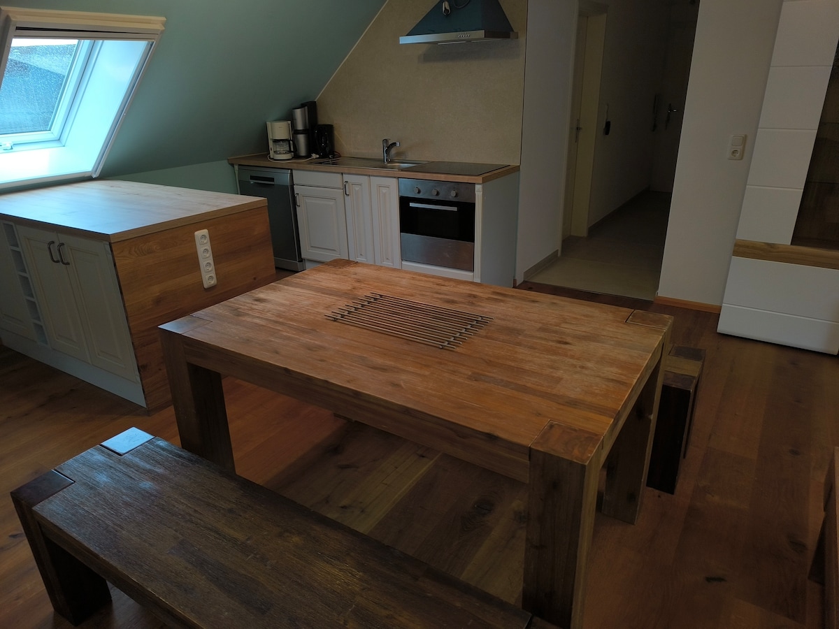 Навіть проїзд на проспекті дозволяє спуститися вниз. Незалежно від того, чи після напруженого дня на роботі, чи для кількох розслабляючих днів у сільській місцевості, спокій заспокоює. Квартира в старому сімейному помешканні початку XX століття має особливий колорит. Шлях повз родову галерею до затишної - дещо скандинавської квартири - з вітальнею/їдальнею, розкладним диваном і затишною спальнею з видом на сільську місцевість. Ви можете тут жити.