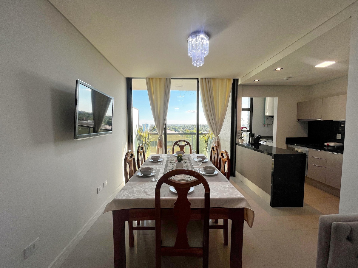 Departamento de Lujo. 2 Habitaciones. 2 Baños. Ubicación estratégica a minutos del centro de la ciudad, a metros de parada de taxi y parada de bus, a una cuadra de la Ruta internacional PY02. Está a pasos del Shopping Arena y Plaza Noblesse, Shopping Lago, la zona cuenta con peluquería, lugares gastronómicos, gimnasio, bancos y casas de cambios. El edificio cuenta con una hermosa vista panorámica a la ciudad y seguridad con monitoreo las 24 horas.
