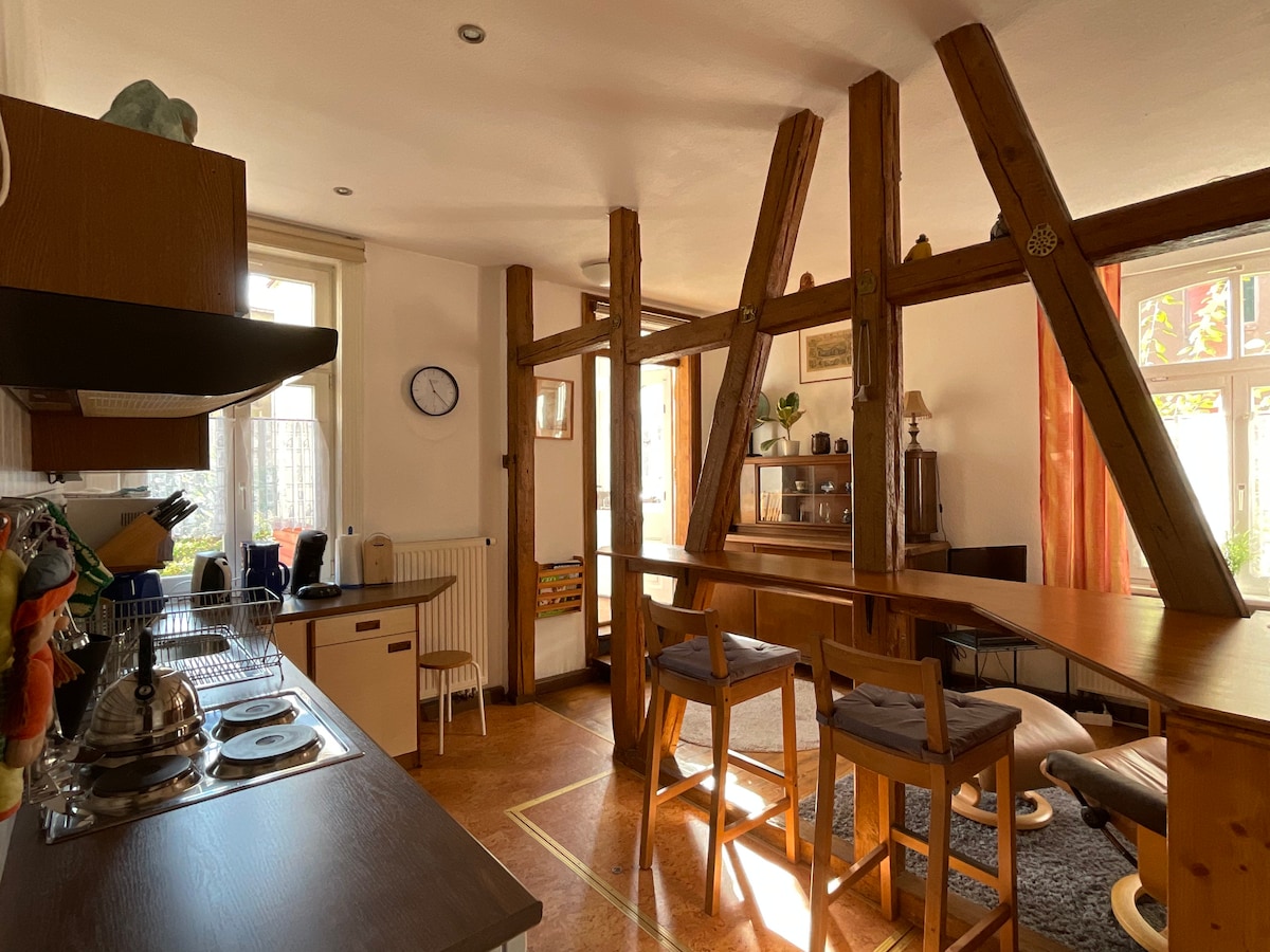 Ласкаво просимо до нашого 130-річного фахверкового будинку біля підніжжя Вартбургу! Колись тут була кузня, а тепер це помешкання для сімейного відпочинку з повним набором зручностей. Квартира розташована в центрі Айзенаха, недалеко від центру міста, магазинів, туристичних пам'яток та унікальних природних красот Тюрингійського лісу! Наша дитяча кімната розташована безпосередньо над помешканням для відпочинку. Ми робимо все можливе, але іноді все одно може чутися шум.