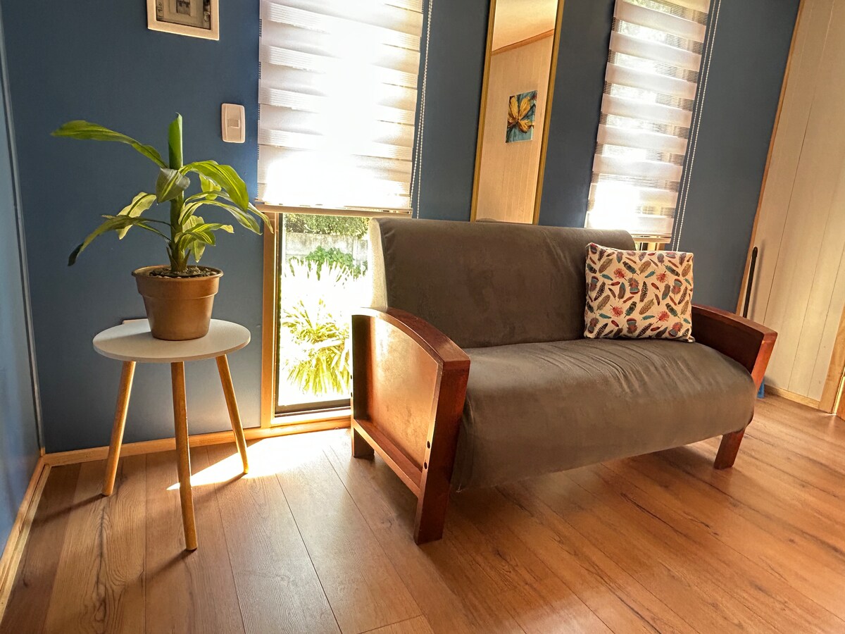Disfruta de la sencillez de este alojamiento. Amplia cabaña ubicada en un barrio tranquilo, en patio trasero de casa habitacional, cercana a supermercados, parques, hospitales y restaurantes, con excelente acceso a locomoción. Cuenta con entrada independiente y tiene disponible un estacionamiento cerrado. Cuenta además, con una maravillosa y amplia terraza rodeada de naturaleza. La cabaña cuenta con calefacción central, además de calentador eléctrico, cama matrimonial y un sillón cama.