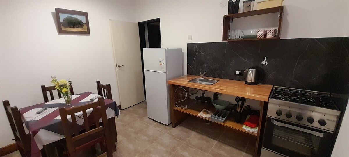 Acogedor departamento totalmente equipado. Cuenta con dormitorio con ropa de cama, baño privado con agua caliente y toallas, living comedor amplio con sofá cama y cocina integrada con lo esencial. Dispone de aire acondicionado en todos los ambientes y estacionamiento propio. Su patio con asador, bajo un caldén centenario, ofrece un entorno único y natural. Ubicación accesible, ideal para descanso o trabajo.
