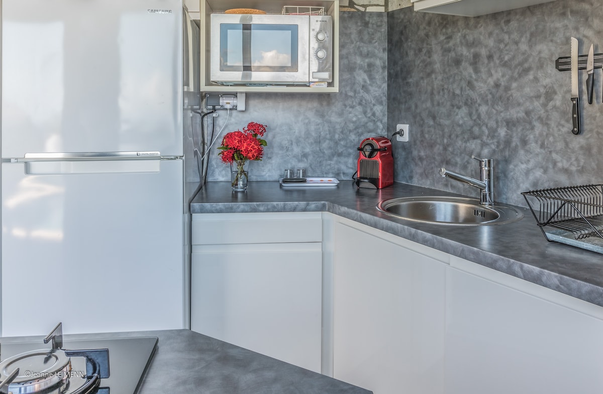 Ласкаво просимо в Residence Cadence. Ця нова квартира площею 45 м2 розташована в центрі острова, в районі Камаруче, розташована в новій резиденції на першому поверсі, пропонує багато об 'єктів. У ньому є тераса, спальня з двоспальним ліжком, велика ванна кімната з подвійною раковиною та душовою кабіною, а також повністю обладнана кухня та вітальня. Сучасний і тропічний декор приведе вас до подорожі!