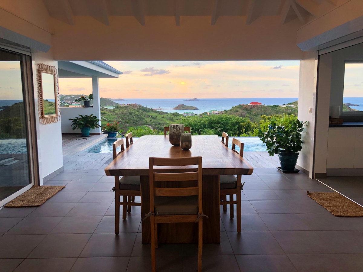 Нова вілла, дуже гарна та розслабляюча, з чудовим видом на затоку Пті-Куль-де-Сак. Це помешкання сповнене чарівності з його невеликим традиційним корпусом St Barth (3-тя спальня), ідеально підходить для проживання з сім 'єю ... Він складається з обладнаної кухні з їдальнею та невеликою відкритою вітальнею з видом на басейн та море. Лаунж-зона з кондиціонером (телевізор). 2 спальні, роздягальня та невеликий офіс, 2 ванні кімнати. Почувайтеся як удома !