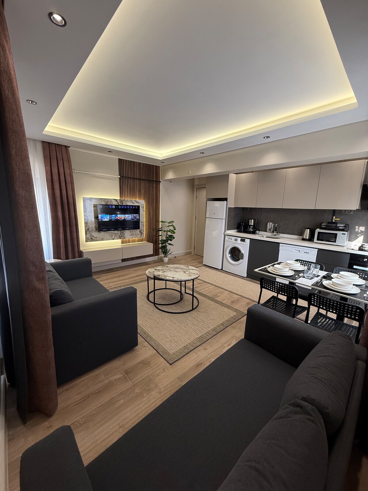 Ви будете поруч із усім у цьому помешканні, розташованому в центрі міста. Ця квартира з однією спальнею, однією вітальнею з просторим помешканням - ідеальний варіант для сімей та груп! Усі зручності помешкання знаходяться неподалік. Готельний концепт змішаного життя має всі види послуг і візьміть наш експеримент на тривалий термін перебування з комфортною та розкішною квартирою на найвищому рівні. Безкоштовний доступ до критого та відкритого басейну, тренажерного залу, СПА-САЛОНУ, хаммаму та сауни, а також до дивовижного пляжу Сіріус-Сюд буде з вами під час вашого перебування.