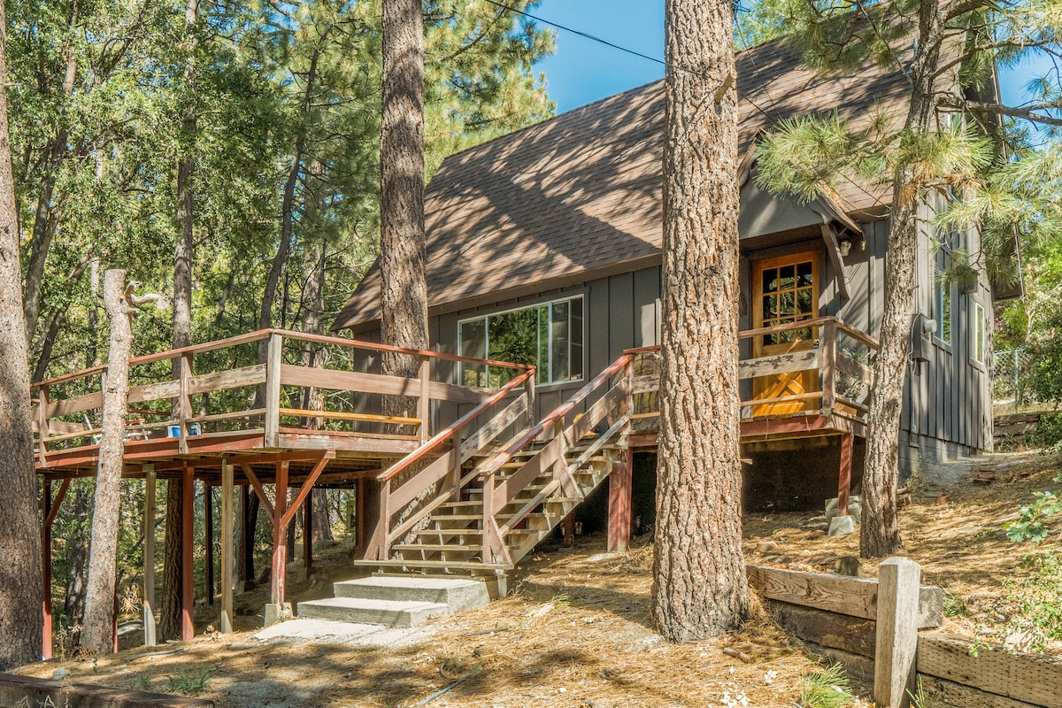 Welcome to a spacious A-frame cabin with spacious exterior deck and amazing 180 degree views. The cabin is set in a tranquil location in a natural setting among green pine trees and rock formations, and encourages ideal indoor/outdoor living during your stay. The cabin rests a pleasant 8 minute/3 mile drive away from downtown Idyllwild. The tactile rock formations visible from the main deck of the cabin are easily accessible from the main road, and only 2 minute walk from the cabin.