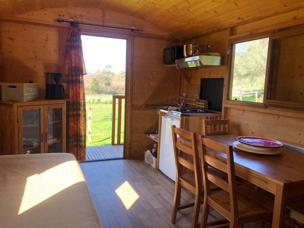 Découvrez le charme vintage de cette roulotte, décorée avec soin. Vous y trouverez tout le confort nécessaire pour passer un bon séjour : litterie adaptée en 140x190, salle de bain privée, cafetière, théière, grill pain, micro-ondes, lave-vaisselle, réfrigérateur/congélateur, télévision, salon de jardin, barbecue... Le logement est neuf, et a été construit sur mesure, ce qui nous a permis d'optimiser l'espace et de pouvoir penser chaques détails ! Il se situe au milieu de l'axe ajaccio /bastia.