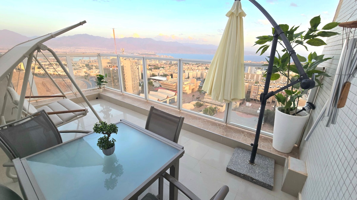 Вражаюча розкішна квартира в Ейлаті, на високому поверсі з захоплюючим панорамним видом на море та гори. Квартира простора та оформлена з розкішним смаком, включає 3 особливо затишні спальні та вітальню, повністю обладнану кухню, сонячну терасу, що ідеально підходить для чарівних заходів сонця перед видом. Чудово підходить для сімей, пар або груп, які шукають тихе, комфортне помешкання найвищого рівня. Відмінне розташування, поруч з морем, ресторанами та магазинами.
