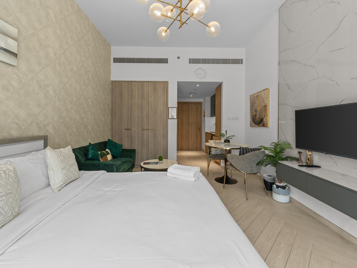Ви будете гостювати в чудовій студії в Дубай Студіо Сіті, де поруч є всі види ресторанів, кафе, супермаркетів та дитячий майданчик. Торговий центр First Avenue Mall знаходиться всього за 5 хвилин їзди, У квартирі є все необхідне для короткого або тривалого перебування, зокрема повністю обладнана кухня, ванна кімната з необхідними туалетними приналежностями та затишне ліжко розміру Queen size.