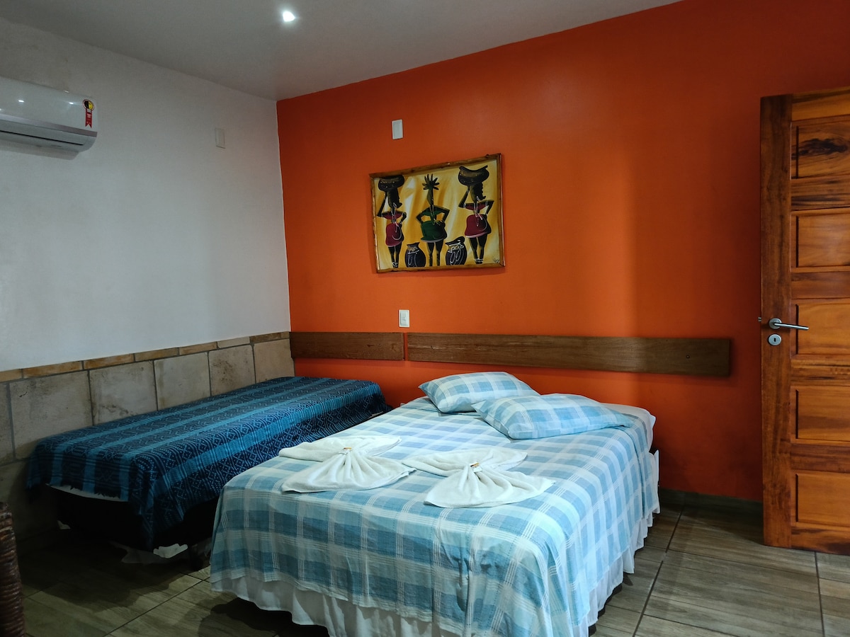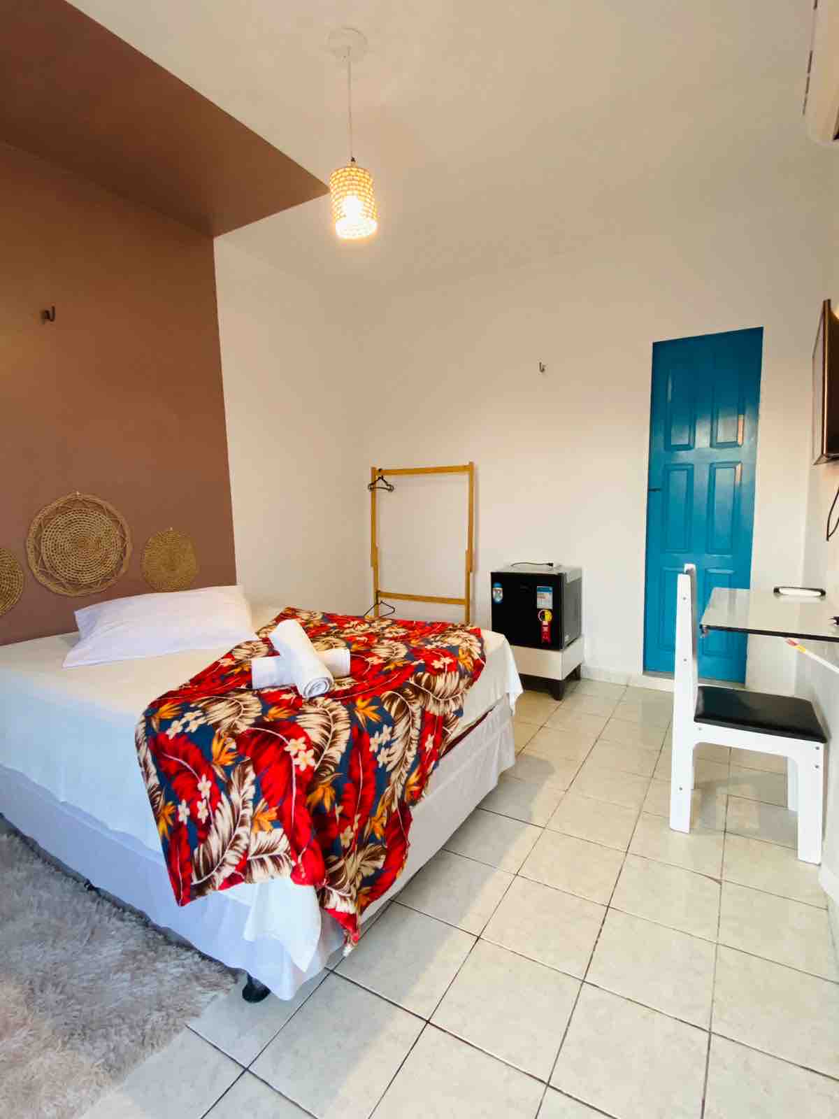 Quarto para até 3 pessoas com frigobar, ar condicionado, cofre, chuveiro elétrico, TV tela plana 21', Netflix, WiFi, rede na varanda. No quarto encontrarão kit de limpeza se precisarem. Toalhas e lixo serão trocados sempre que necessário.