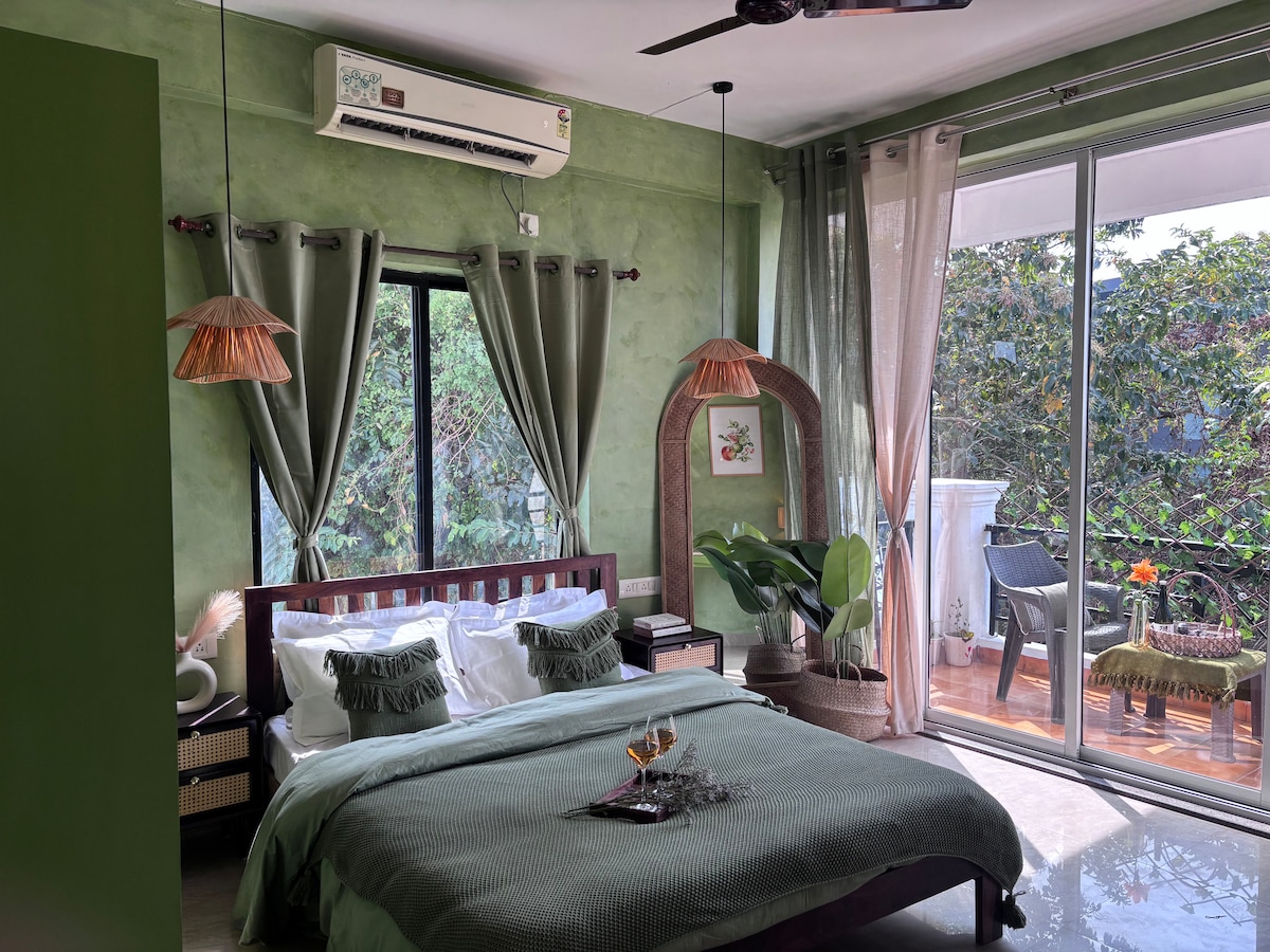 Certified by Goa Tourism 950 sq ft air-conditioned apartment: 2 bedrooms, 2 bathrooms, TV/living room, open kitchen; laundry nook + 500 sq ft non-air-conditioned space: dining for 4; sunroom sit-out; shaded patio; open-air balcony 300mbps internet; 4-5hr power backup; 50" Smart TV; books; board games; workstation & covered car park Located in Porvorim: 15min Panaji/Mapusa; 25min Calangute/Baga; 30 min Anjuna/Vagator; 45-60min Ashvem/Mandrem/Arambol; 60-75 min South Goa beaches; 120min Palolem