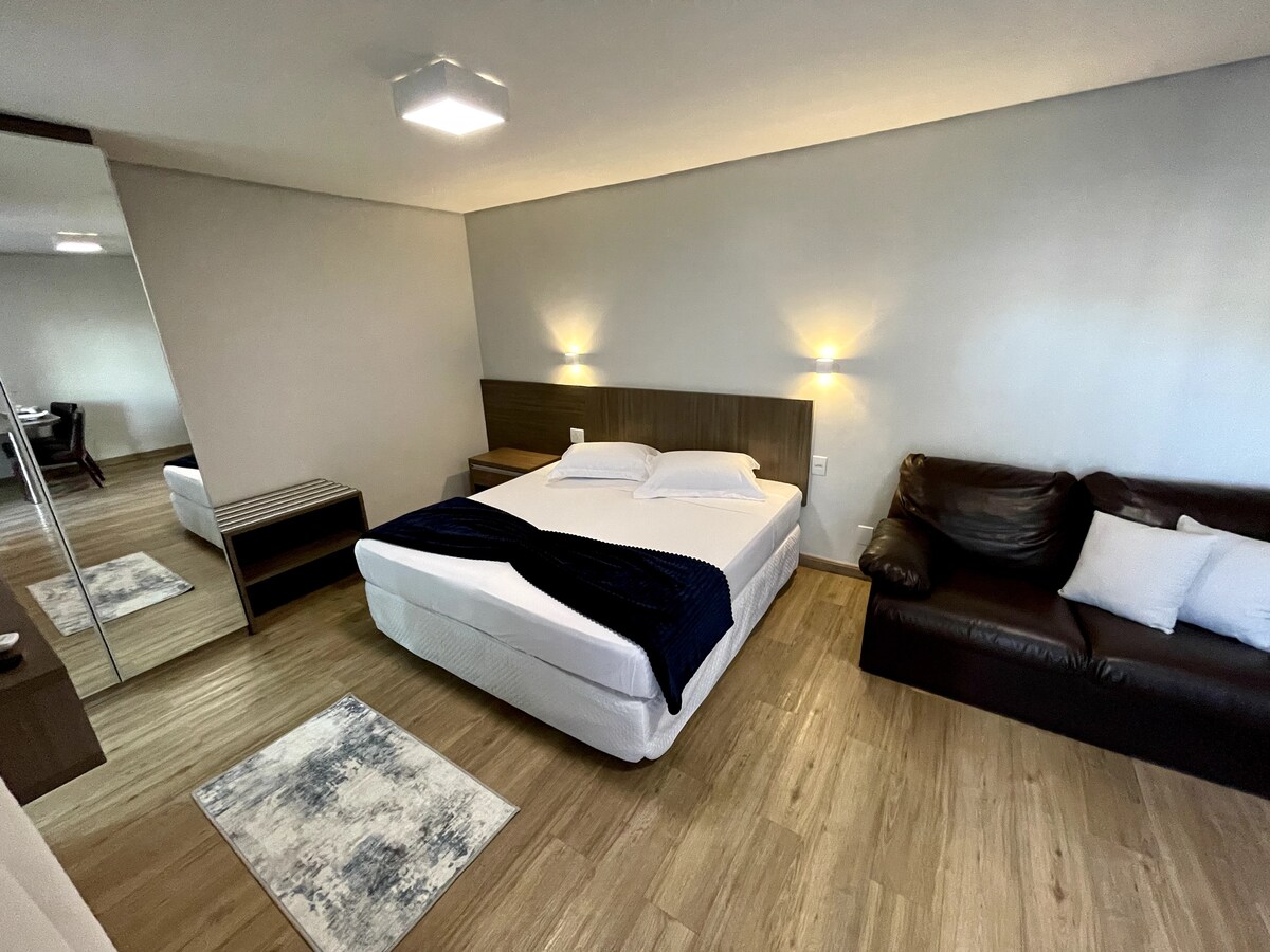 Квартира високого класу в Еді. Metropolitan Sidney, в центрі Жуандіау-ді-Гояс. Основні моменти: • Дах з безкрайнім басейном і дивовижним видом • Тренажерний зал і сауна • Швидкий Wi-Fi та спліт-система • Безкоштовний гараж Ідеальне розташування: прогулюйтеся до парку Фламбойант, торгового центру Фламбойант та чудових ресторанів. Ідеальне місце для тих, хто шукає комфорт, безпеку та найкращу зону відпочинку в Гоянії.