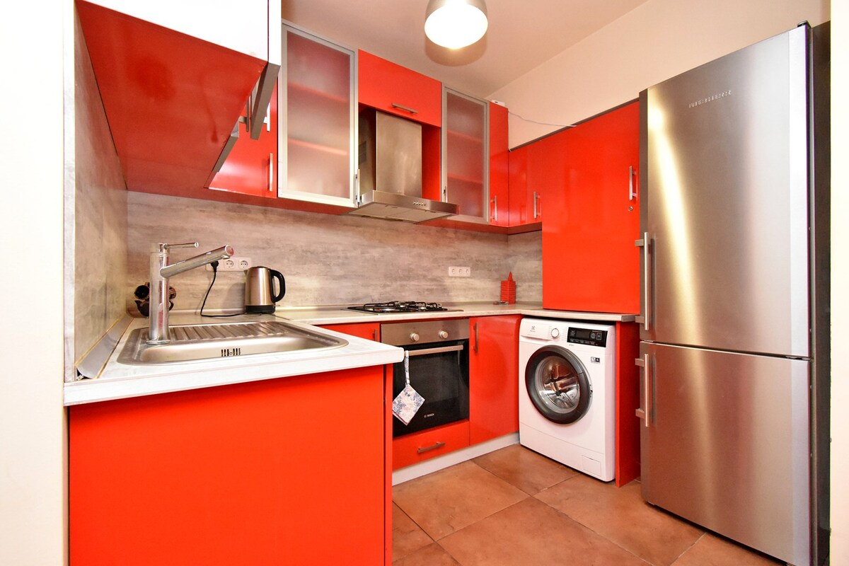 Ця чарівна розкішна квартира знаходиться в центрі Єревана - 2 хвилини ходьби від площі Республіки, простора та сонячна. Високі стелі, зручне ліжко розміру King size, робоча зона , все необхідна кухня у вітальні з величезним і красивим диваном-ліжком для відпочинку в гармонії з ергономічним дизайном. Квартира знаходиться на 1-му поверсі кам 'яної будівлі, сусідів із лише офісними задніми дверима; менше особистої взаємодії, без шуму. Підігрів підлоги, Wi-Fi 50 Мбіт/с, смарт-телевізор, супермаркет +24/7, місця харчування, магазини, автобусні зупинки.