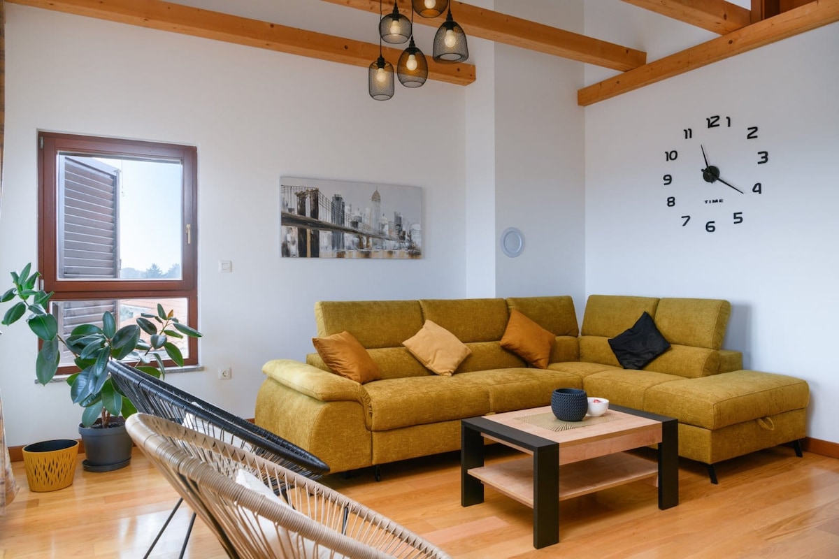 Ці чарівні апартаменти підходять для молодих гостей, цифрових кочівників та любителів велосипедів, оскільки вони пропонують гараж для велосипедів. Звідси відкривається прекрасний вид на море з трьома балконами. Воно розташоване на другому поверсі (мансарда), тому не підходить для гостей з обмеженою мобільністю через кругові сходи. Відстань від морського узбережжя становить 250 м, а від піщаного пляжу — 1000 м (15 хвилин пішки). Найближчий ресторан знаходиться в 50 м. Ринок «Станіч», м’ясний магазин, пекарня 250 м, великі ринки: Lidl і Plodine 600 м.