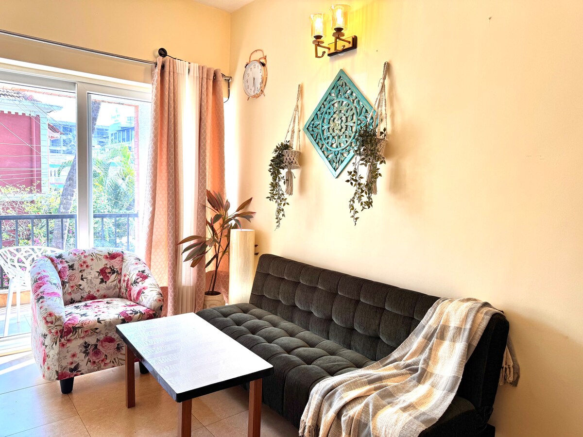 Modern Boho Apartment | Minutes from North Goa's Beaches.A cozy, fully furnished 1BHK retreat on ground floor perfect for couples, friends, or small families. Highlights: - Stylish Boho Interiors with a warm vibe - AC in bedroom & living room for comfort - Smart TV + High-speed WiFi - Equipped kitchen with RO water, cooktop, fridge & washing machine - Shared swimming pool (9 AM–6 PM | swimwear mandatory - On-site gym available at INR 200/-per person per day - 24/7 security - Free Parking