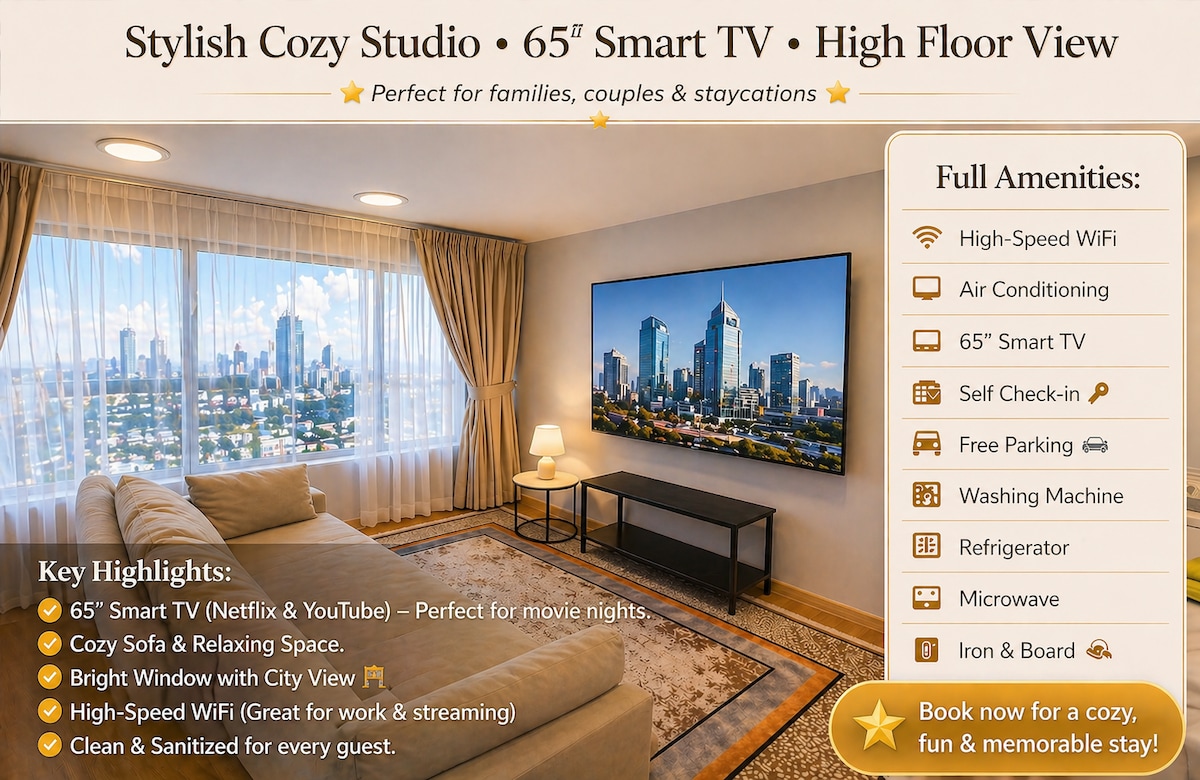 📍Pertama Residence Ласкаво просимо до Грей-Сіті! Ця студія нещодавно облаштована з великою любов 'ю, поєднує в собі сучасний декор із сучасними зручностями та враженнями, якими можна насолоджуватися, особливо джакузі з вашою любов' ю та 100-дюймовим екраном проектора з Netflix. Ця унікальна оселя має власний стиль, вона пропонує затишне, чисте, тихе та освіжаюче помешкання для пар. Приходьте і відчуйте себе в Сірому місті! До зустрічі.
