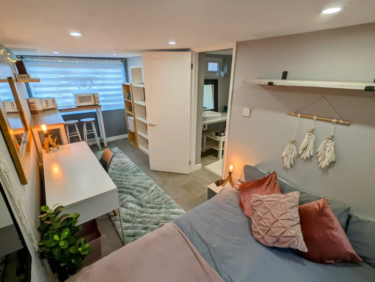 Чудова квартира-студія з парковкою на проїзді, недалеко від центру міста Гілдфорд. Ліжко розміру «king size», обладнана кухня з духовкою/мікрохвильовою піччю, холодильником, кавоваркою Nespresso, смарт-телевізором та ванною кімнатою з душем. Ми розташовані в дуже тихому районі, але всього за декілька хвилин їзди від центру Гілдфорда. Наш сад межує з Норт-Даунсом, який чудово підходить для пішоходів. Приватний вхід (сходинки) та безкоштовна парковка за електричними воротами. Молоко, чай, кава тощо, і все інше, що вам потрібно.