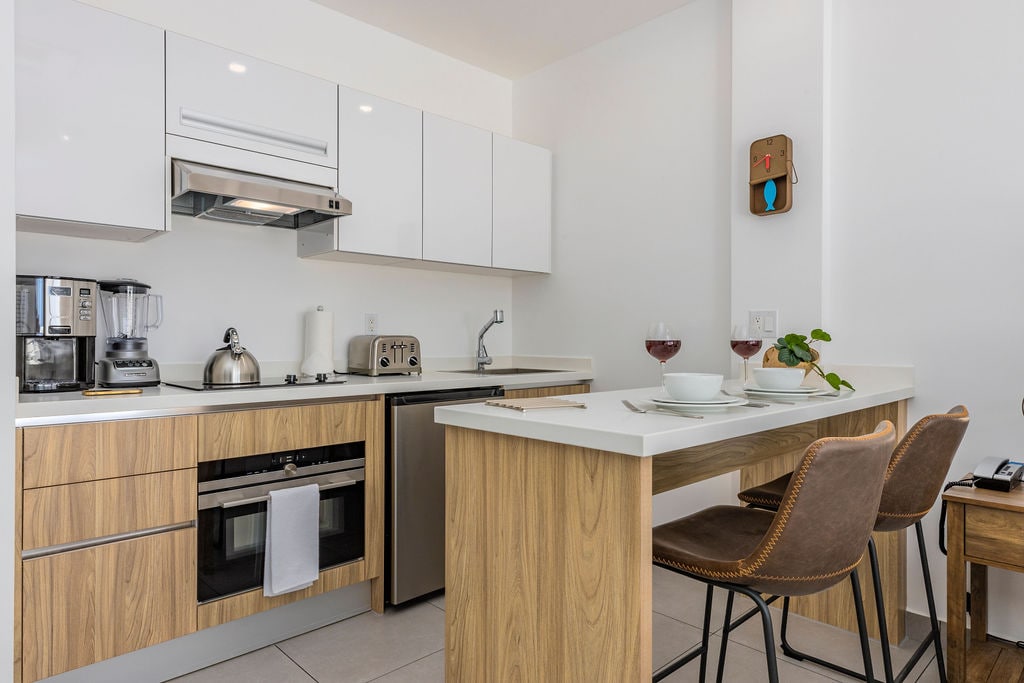 Ця красива студія відображає сині кольори Аруби з дуже сучасним і ЧИСТИМ дизайном, що пропонує дуже зручне ліжко розміру KING size та подушки розміру King size, повністю функціональну кухню, красиву гардеробну шафу, сучасну ванну кімнату зі спа-салоном, як-от душова кабіна для опадів. Розташована на найвищому поверсі будівлі з приголомшливим видом на центр Аруби, а також на гавань! Насолоджуйтеся панорамним басейном і гідромасажними ваннами на даху з видом на 360 років і сучасним тренажерним залом з видом на воду та круїзні лайнери!