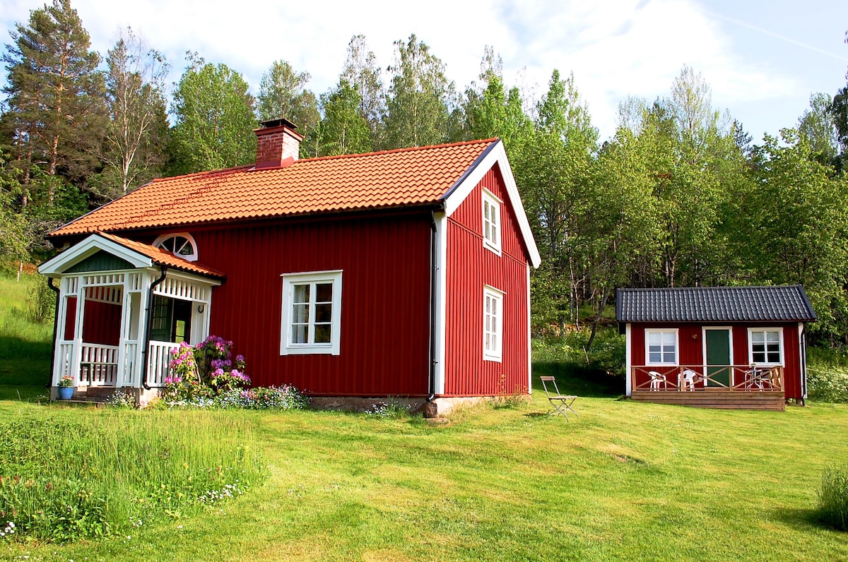 Boende på lantlig gård. Vackert hus för fyra personer, möjlighet till extra säng. Här bor ni själva då huvudbyggnaden står tom under sommaren. Närhet till fiske, bad, skog och betande djur. Avskilt läge, väldigt privat med stora ängar kring huset. Möjlighet till att hyra båt samt fiska bara 13 minuters gångväg från huset. Spännande omgivningar för skogsäventyr. Gott om bär och svamp i skogarna under säsongen. Vandringsleder i de direkta omgivningarna.