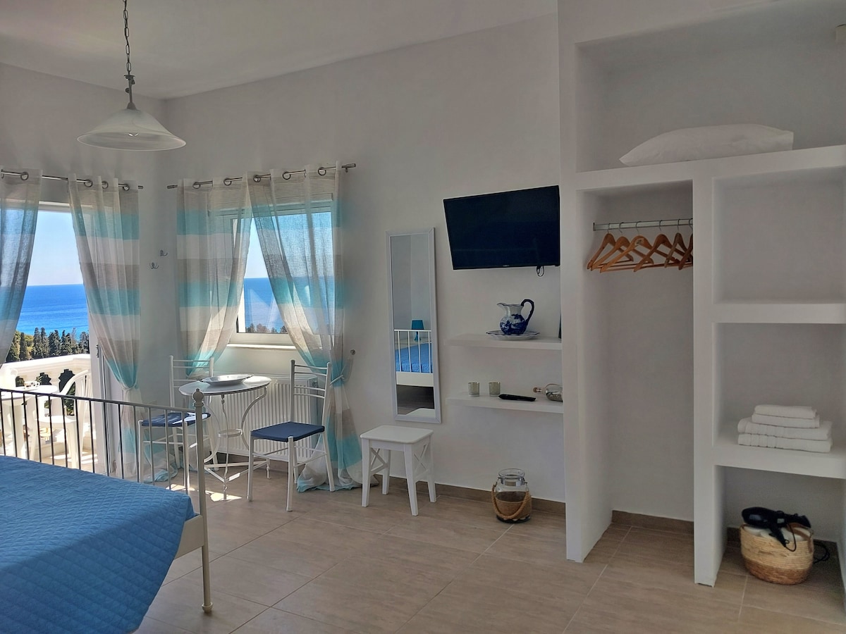 Кам'яний люкс всього в 10 метрах від пляжу. Дуже великі вікна, щоб насолоджуватися видом на море, відкрита пергола з місцем для сидіння та столом. Повністю обладнана кухня та зручна ванна/душ. Піднявшись по дерев'яних сходах, ви потрапляєте до спальні, де краще насолоджуватися видом на море. Велика кількість дерева в поєднанні з вбудованим ліжком і диваном нагадує про величні будинки Кікладських островів.
