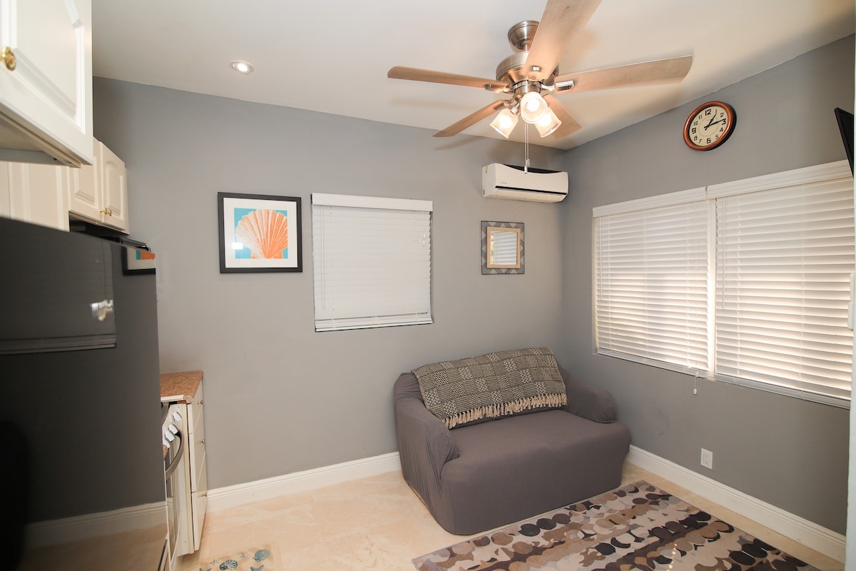 Зручне помешкання з кондиціонером, безпечне та тихе місце в центрі міста. У цій 1-кімнатній квартирі є кухня з плитою, духовкою, духовкою, мікрохвильовою піччю, холодильником, кухонним посудом, пральною та сушильною машиною, пральною та сушильною машиною. Приходьте і розслабтеся в прохолодному помешканні з безкоштовним Netflix у спальні та вітальні. Це місце зручно розташоване в 15 хвилинах їзди від пляжів і центру Нассау та в 5 хвилинах їзди від ресторанів швидкого харчування, банків, місцевого супермаркету та аптеки. Курити у помешканні заборонено.